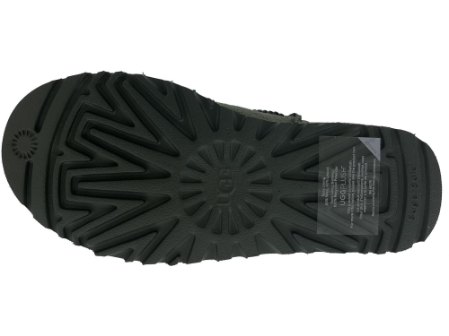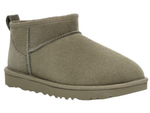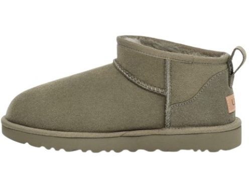 Green suede ladies classic ultra mini by Ugg, color msg. This model is made of suede on the outside and pre-treated with stain and water repellents. The lining is made of the well-known sheep's wool so that the feet are always warm. The pull tab on the back band helps to ease the putting on and taking off.
