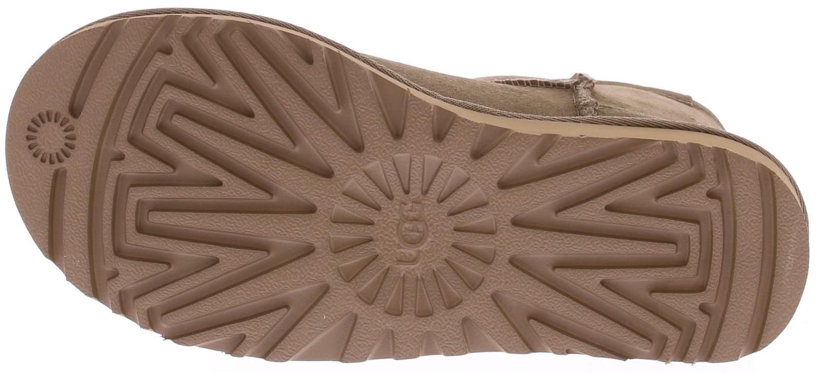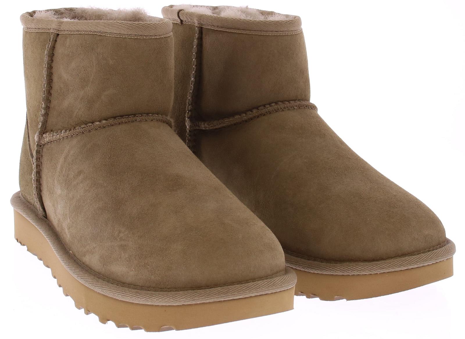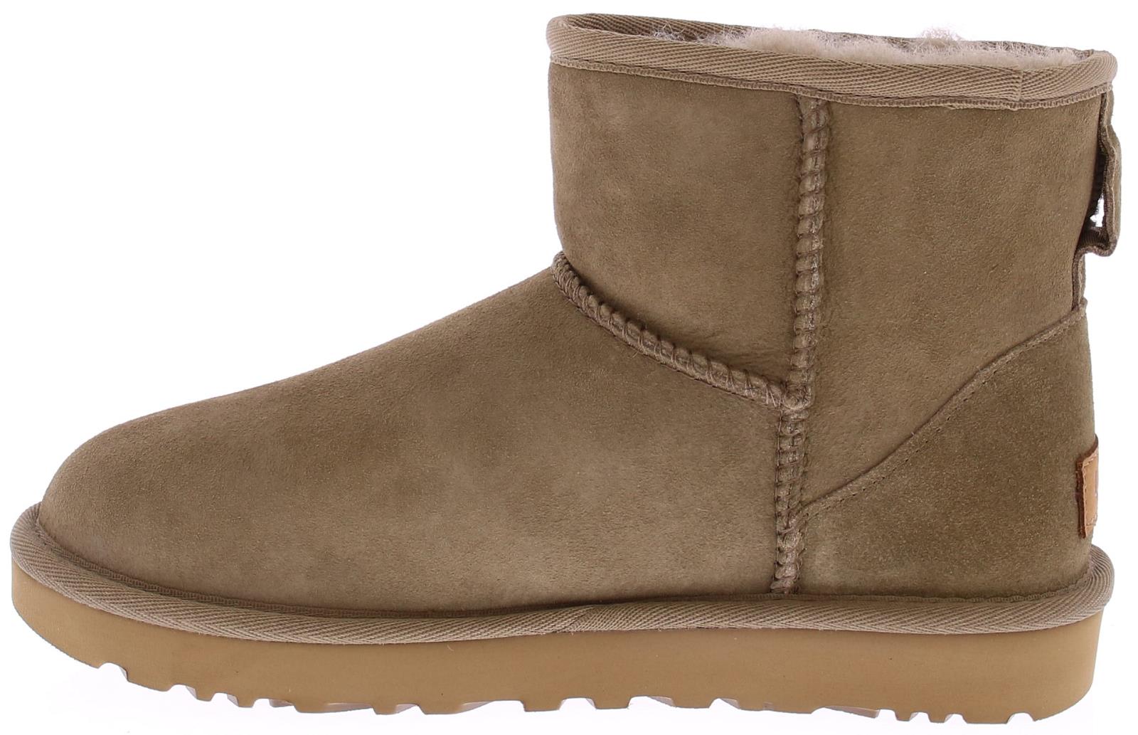 Khaki suede women's boot from UGG. The classic mini 11 features the new lightweight rubber sole and is treated to be water-repellent. The boot is fully lined with sheepskin, which keeps your feet wonderfully warm.