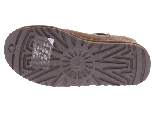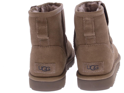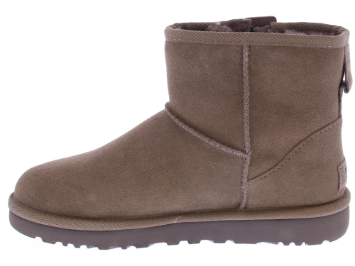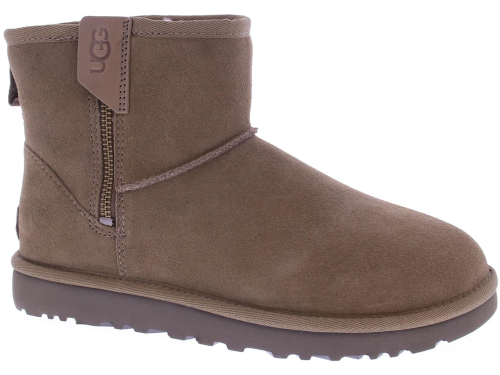 Taupe suede women's boot from UGG. The Classic mini bailey zip in Hickory is made of suede with a lining lined with the signature warm fur and features a convenient zipper for easy on and off. The rounded toe gives these boots a classic and timeless look, making them perfect for any occasion.