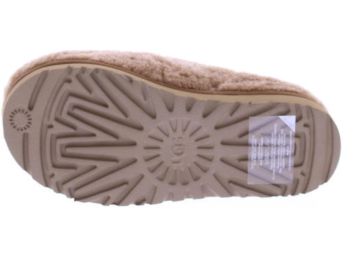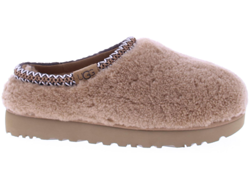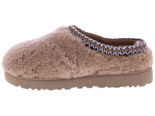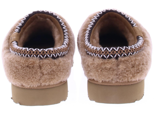 Mid-brown teddy mules from Ugg. This Tassman Ugg Curly is made of incredibly soft teddy fabric with a fur lining and a platform sole. An embroidered border runs along the top of the foot. A fun, trendy mule in soft materials.
