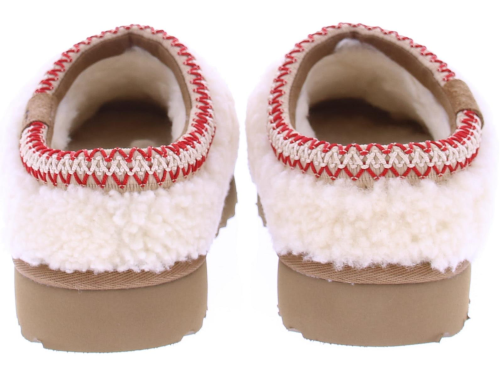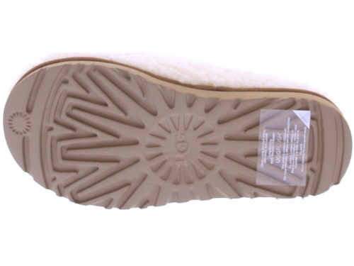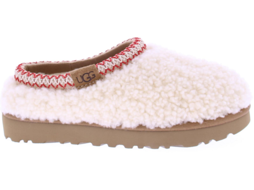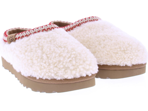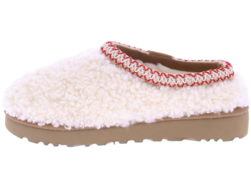 Cream-colored teddy mules from Ugg. This Tassman Ugg Curly is made of incredibly soft teddy fabric with a sheepskin lining and a platform sole. An embroidered border runs along the top of the foot. A fun, trendy mule in soft materials.