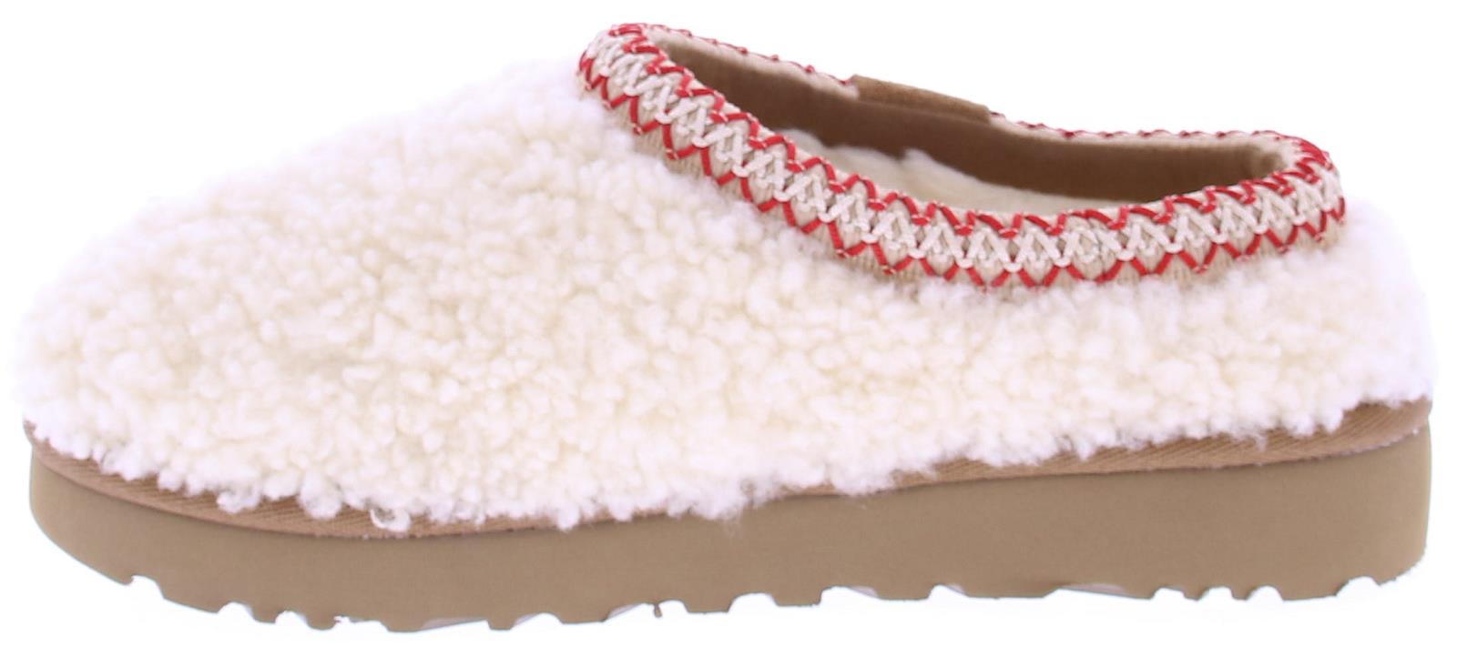 Cream-colored teddy mules from Ugg. This Tassman Ugg Curly is made of incredibly soft teddy fabric with a sheepskin lining and a platform sole. An embroidered border runs along the top of the foot. A fun, trendy mule in soft materials.