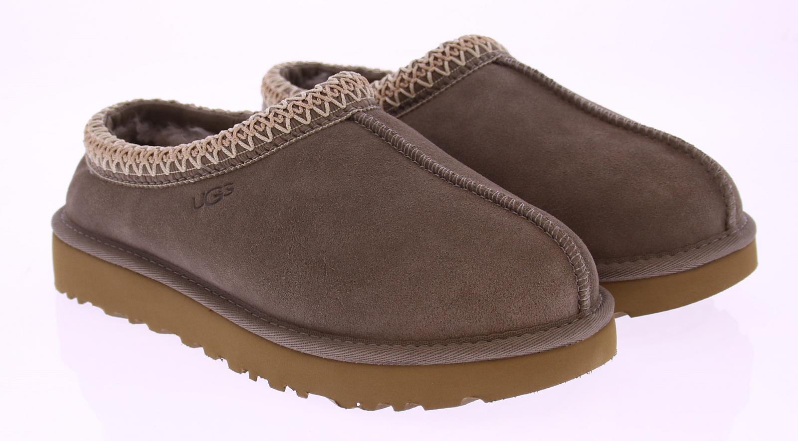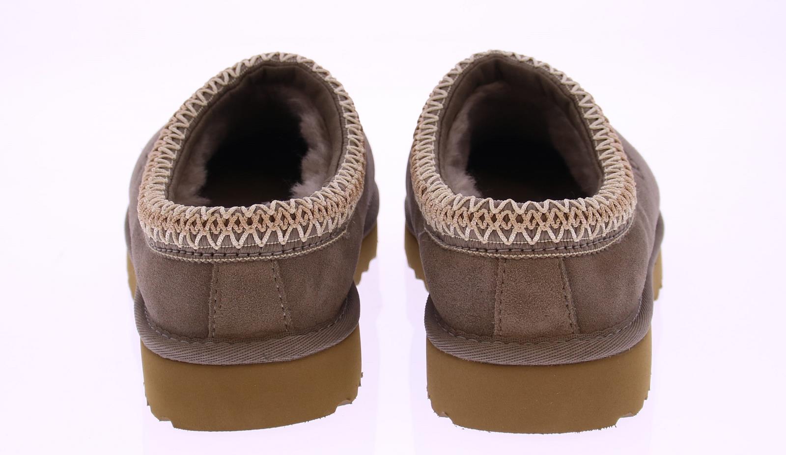 Taupe suede women's mules from Ugg. This Tasman has a lightweight sole. An embroidered border in off-white runs along the instep. Like other Uggs, the lining is made of comfortable sheepskin. The Ugg logo is printed on the side of the instep.