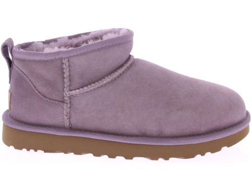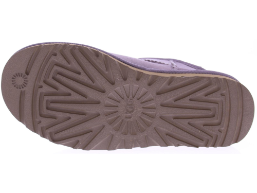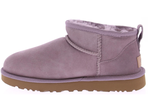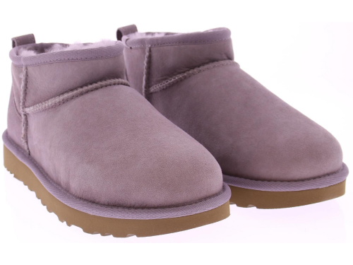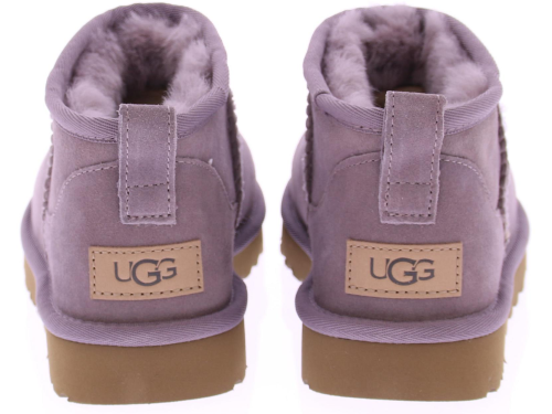 Lilac suede women's classic ultra mini from Ugg. This model, the Ugg Classic Ultra Mini Sugarplum, is made of suede on the outside and pre-treated with stain and water repellent. The lining is made of the well-known sheepskin, keeping feet warm at all times. The pull tab on the back panel makes them easy to put on and take off.