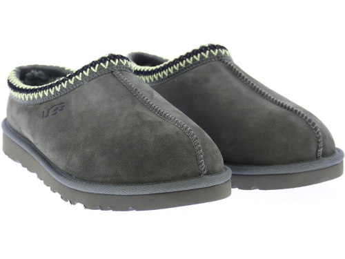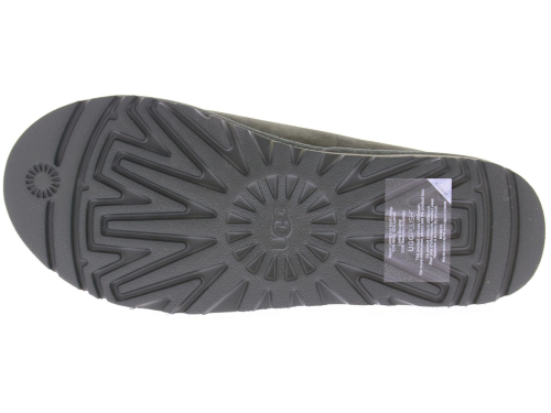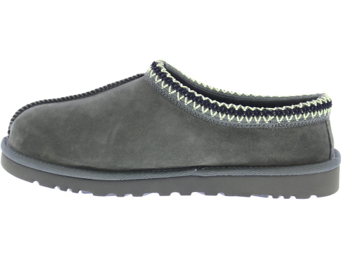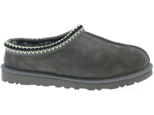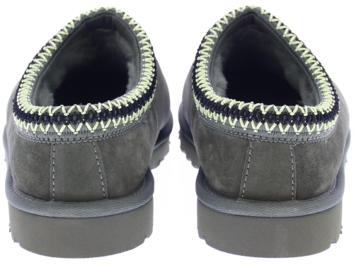 Men's Ugg item Tasman 5950 WLN. The slipper is woodland green and has a fur lining and a rubber sole that matches the upper. The edge features a ribbed edging with chunky stitching in beige tones.