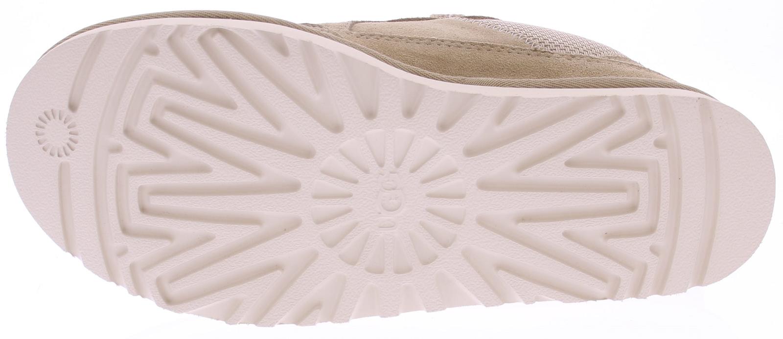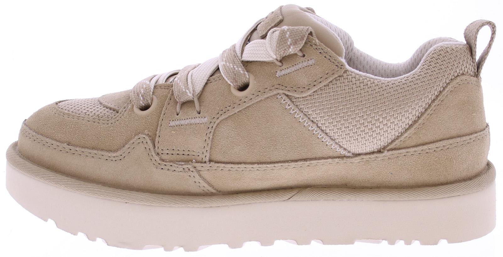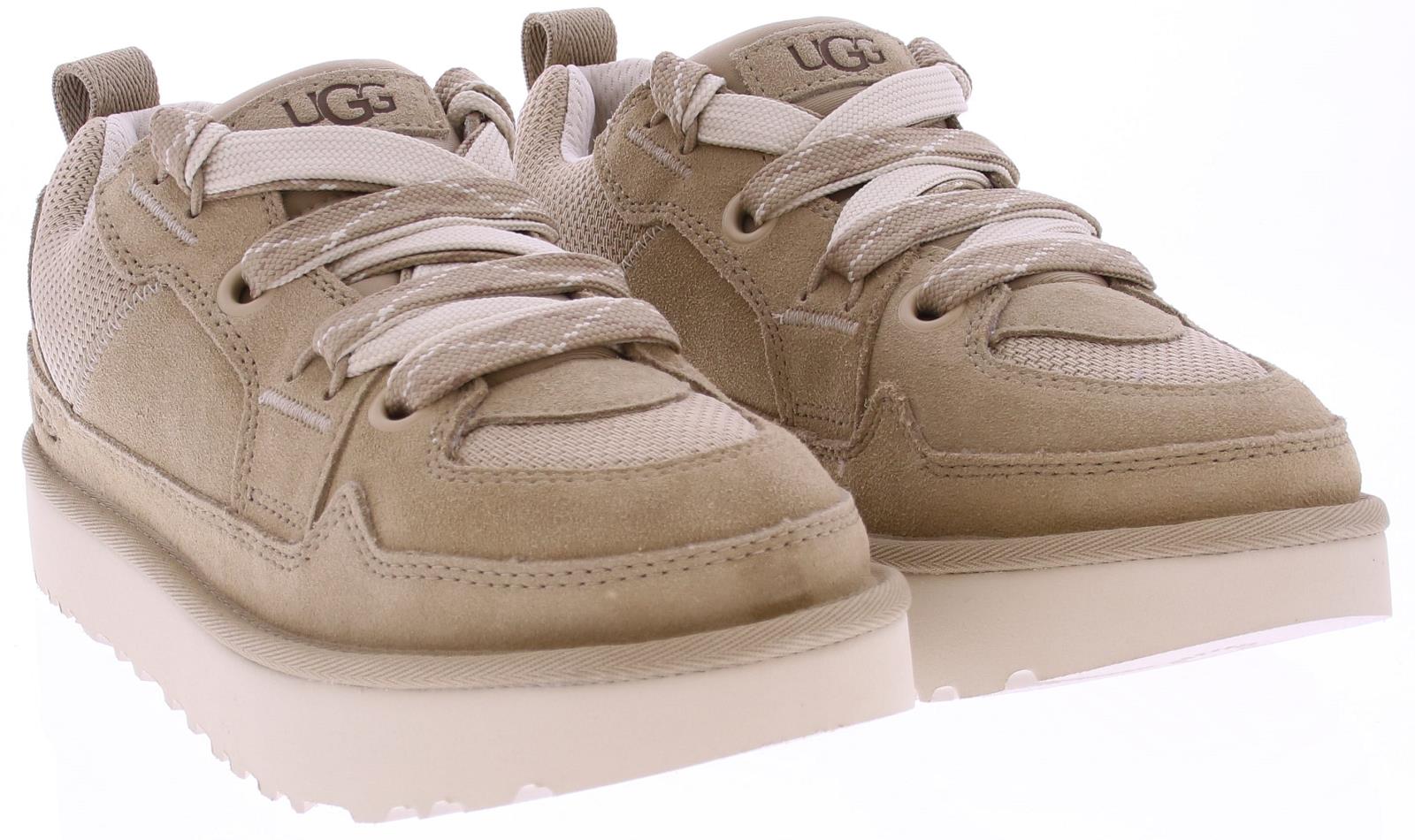 Beige suede men's sneaker/boot from Ugg. The Lowmel Mustard Seed is a low-top sneaker with sturdy, wide laces and a fabric lining. The upper is mostly suede, with a mesh upper. The Ugg logo is printed on the side of the heel.