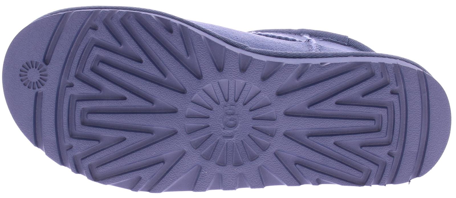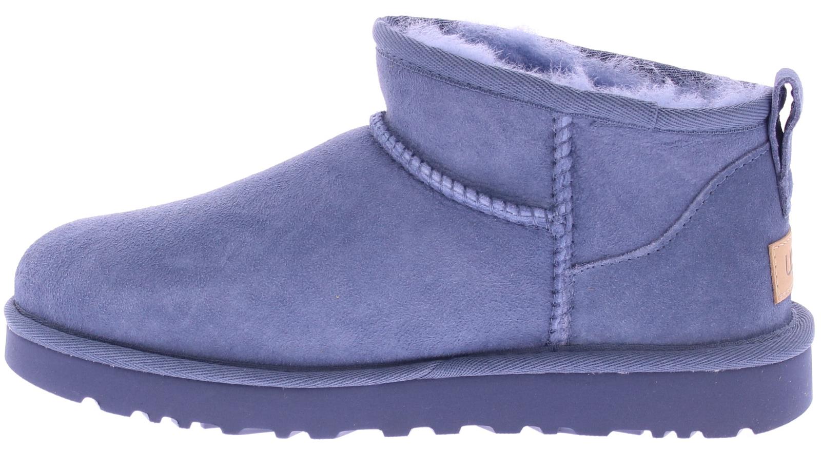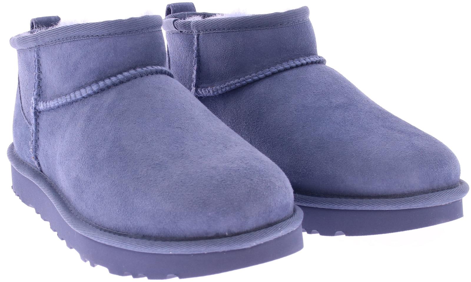 Ugg Women's Classic Ultra Mini Jeans in Blue Suede. This Ugg Classic Ultra Mini model is made of suede on the outside and pre-treated with stain and water repellent. The lining is made of the well-known sheepskin, keeping feet warm at all times. The pull tab on the back panel makes them easy to put on and take off.