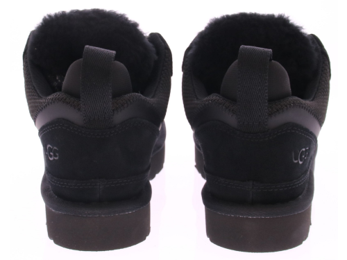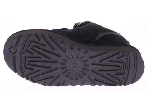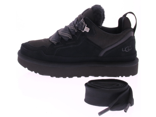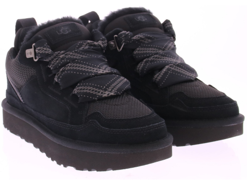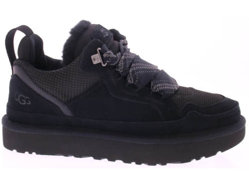 Black suede women's sneaker from Ugg. The Ugg Lowmel is a black women's sneaker made of suede with breathable mesh on the toe. The soft sheepskin lining provides extra comfort, while wide laces and a sturdy rubber sole create a cool, sporty look. Ideal for everyday wear, with a subtle Ugg logo on the heel.