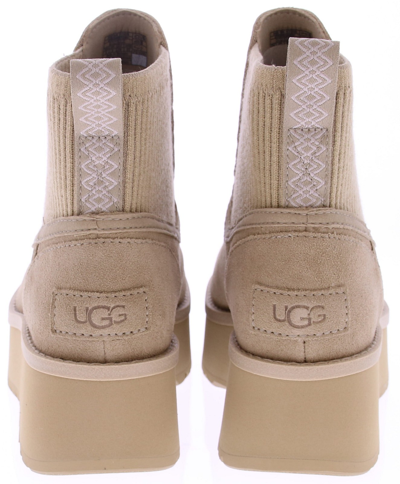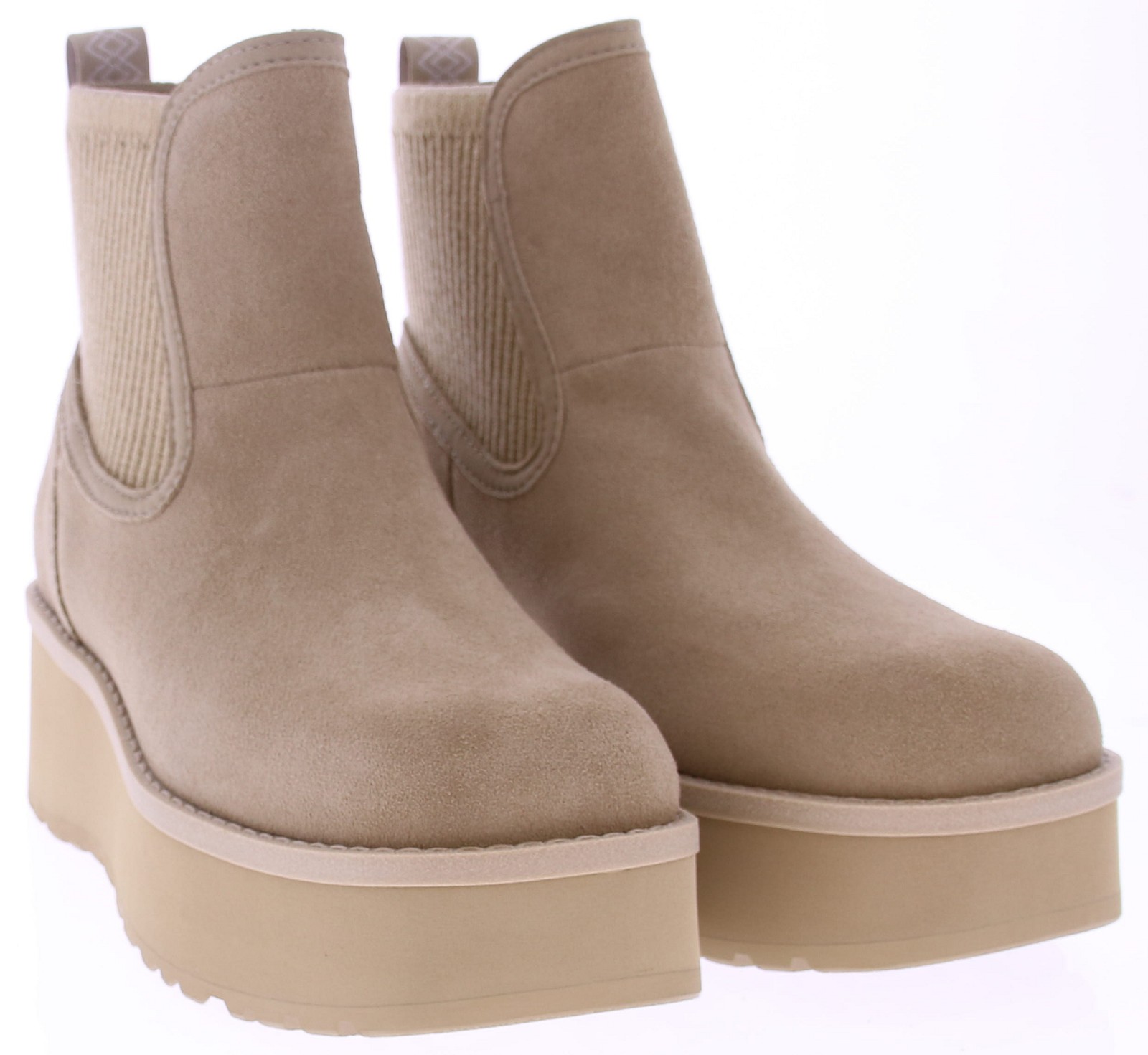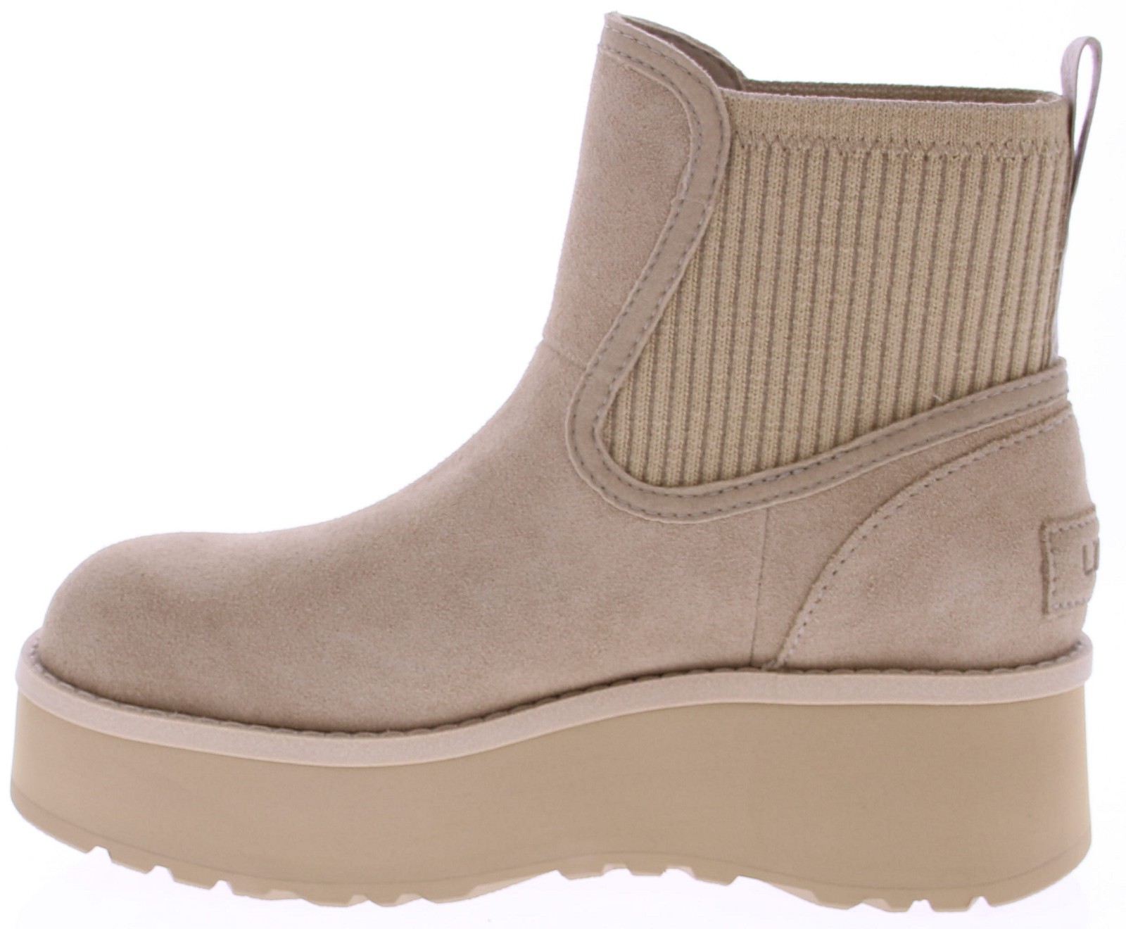 Sand-colored suede women's short boot from Ugg. This City Func Chelsea boot from Ugg is versatile, capable, and incredibly comfortable. It features a striking 1.5" platform sole. Crafted from water-repellent suede for protection from unexpected showers, the boot features a ribbed knit upper for a cozy, textured finish. Thanks to the springy sugarcane-based EVA midsole and lightweight rubber outsole, you'll always look stylish, wherever your day takes you.