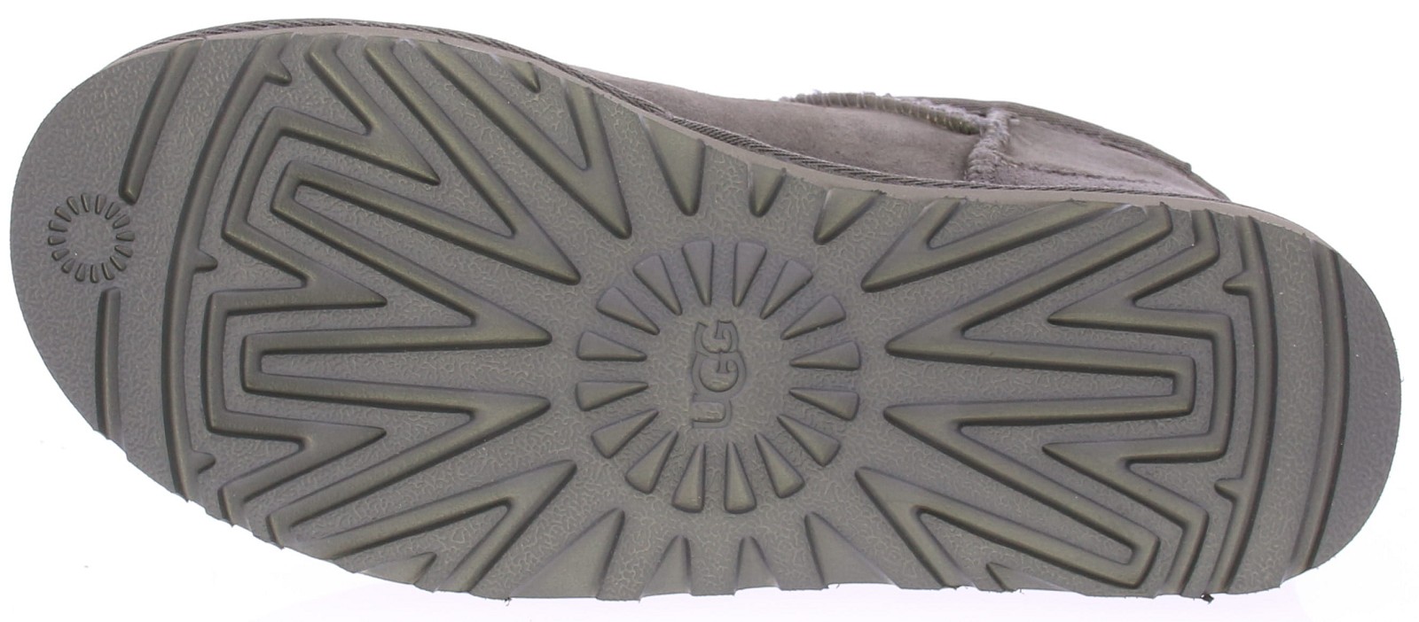 Gray suede women's boot from UGG. This classic mini II gray boot is made of suede on the outside and pre-treated with stain and water repellent. The lining is made of the well-known sheep's wool, keeping feet warm at all times. The pull tab on the back panel makes it easy to put on and take off.