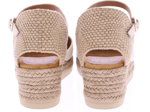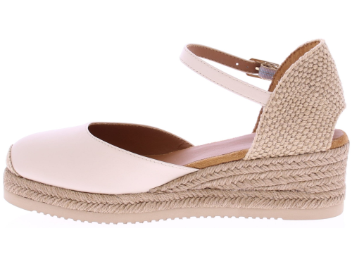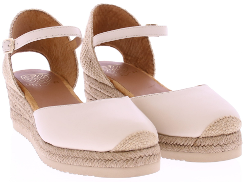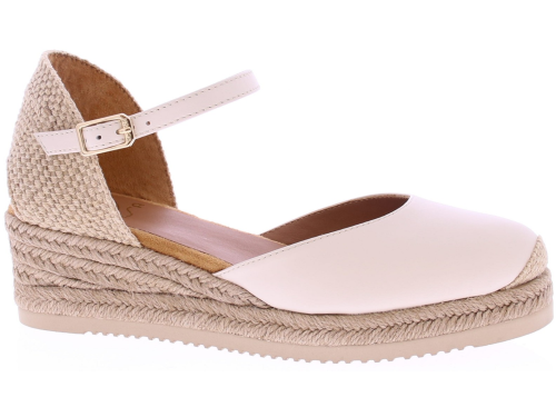 Off-white leather women's espadrilles from Unisa, model Cisca. This summery espadrille features a comfortable 3cm wedge heel and a closed leather toe in soft yellow. The heel is covered in braided jute, and the adjustable ankle strap with a silver buckle ensures a beautiful and stable fit. The braided espadrille sole gives it a natural and sunny look. An ideal style for warm days, perfect with a summer dress or linen trousers. Discover other women's espadrilles from Unisa at Klijsen.