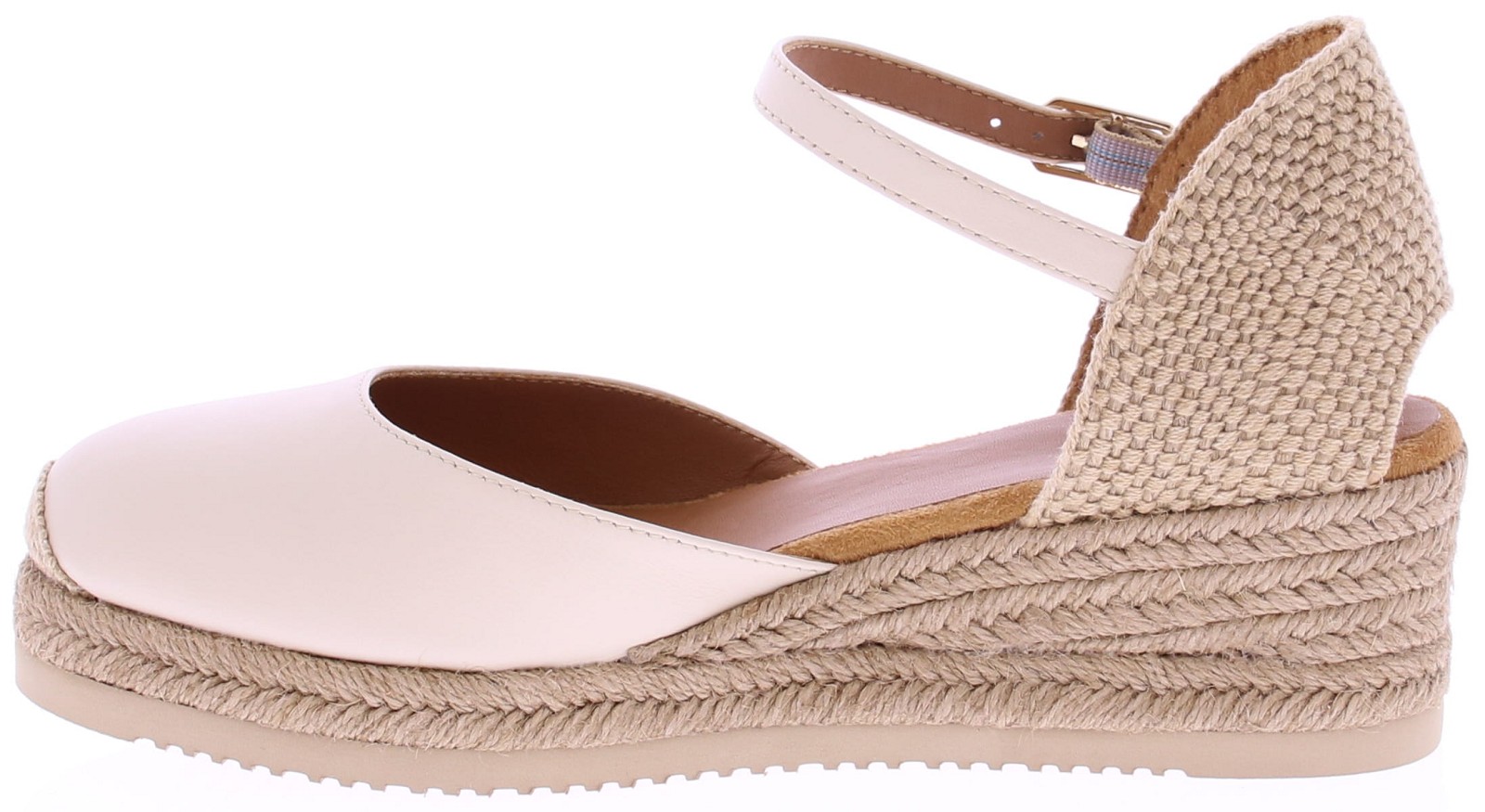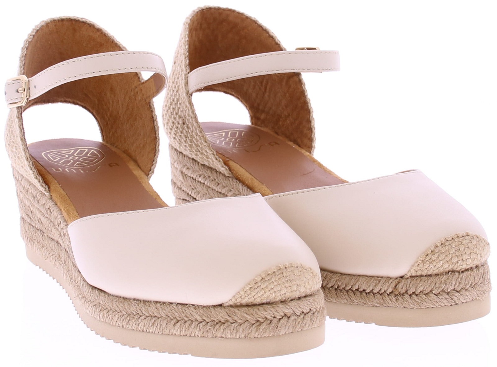 Off-white leather women's espadrilles from Unisa, model Cisca. This summery espadrille features a comfortable 3cm wedge heel and a closed leather toe in soft yellow. The heel is covered in braided jute, and the adjustable ankle strap with a silver buckle ensures a beautiful and stable fit. The braided espadrille sole gives it a natural and sunny look. An ideal style for warm days, perfect with a summer dress or linen trousers. Discover other women's espadrilles from Unisa at Klijsen.