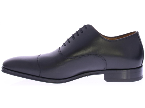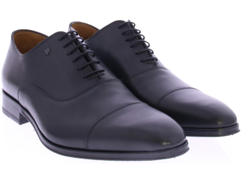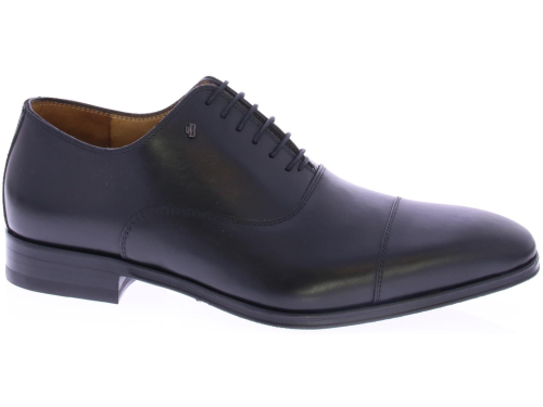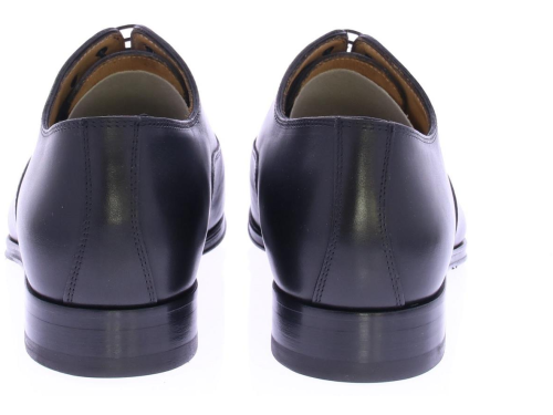 Black leather men's toe seam shoe by Van Bommel. This shoe is made on an H last. The shoe has a leather lining and leather sole with rubber wear surface.