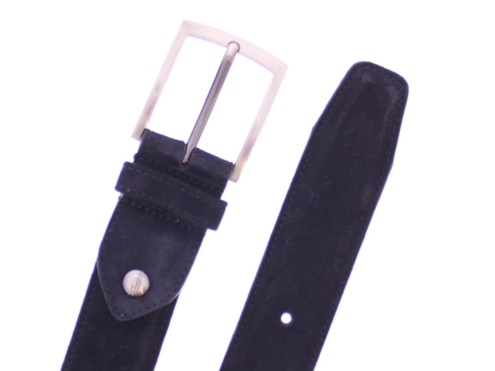 Dark blue suede men's belt with a slim buckle, a timeless design. This belt adds a touch of class to any outfit. The belt is leather lined and can be shortened on the buckle side.
