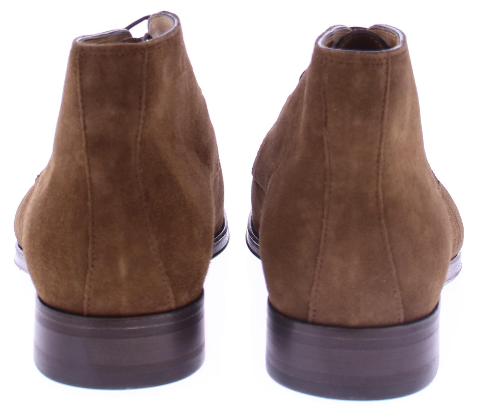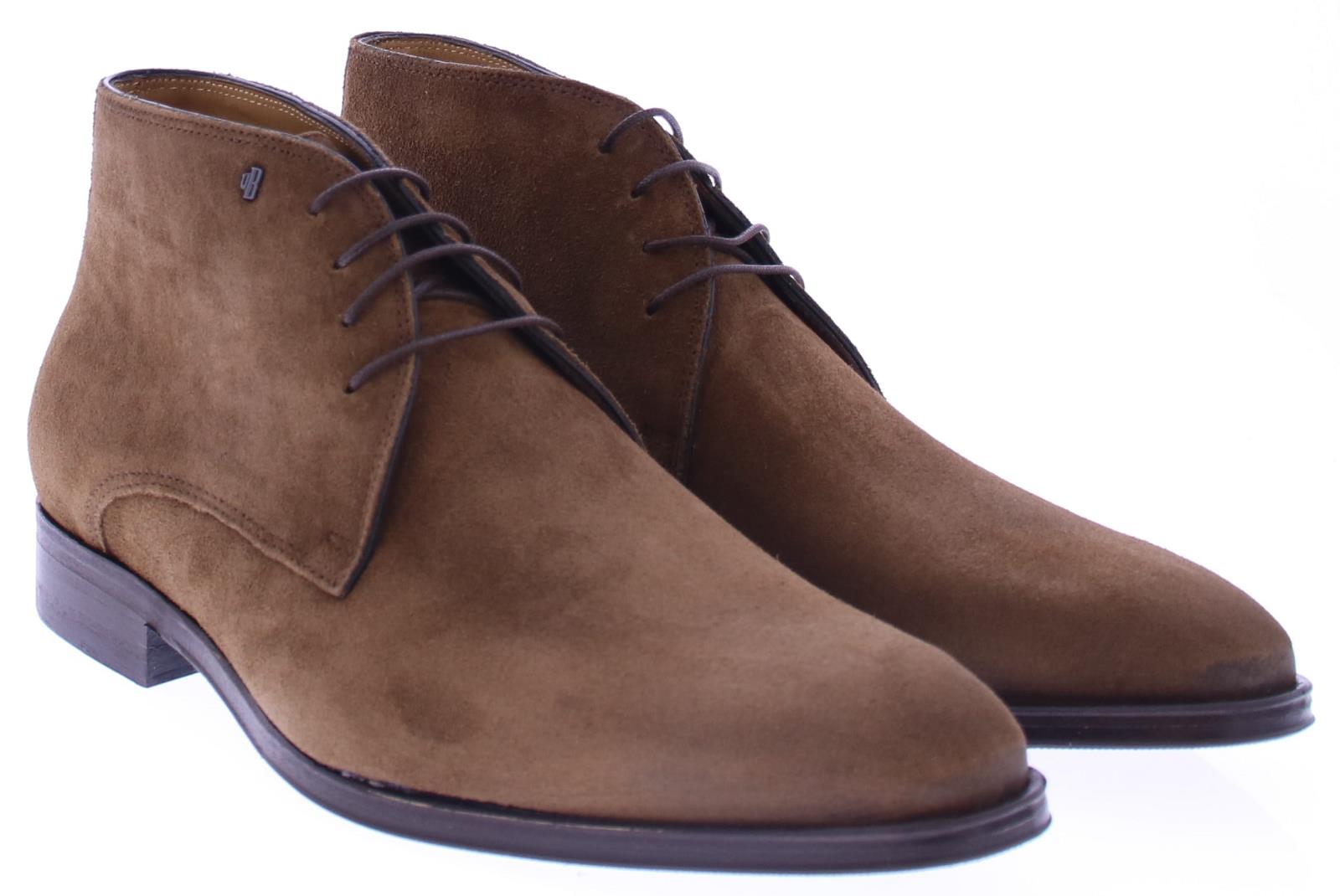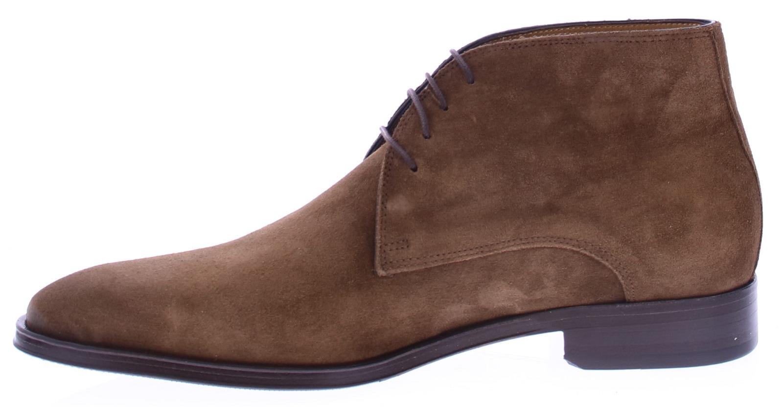 Cognac suede men's lace-up boot by Van Bommel, model SBM-50029-23-01. The upper is made of high-quality suede with a metal Van Bommel tag on the shaft. The graceful lace-up closure with fine round laces gives this shoe a stylish look.