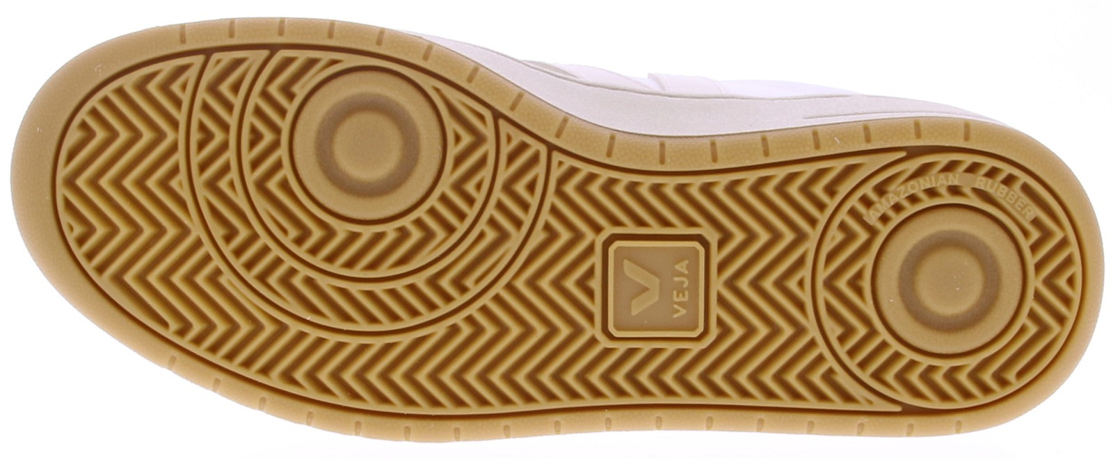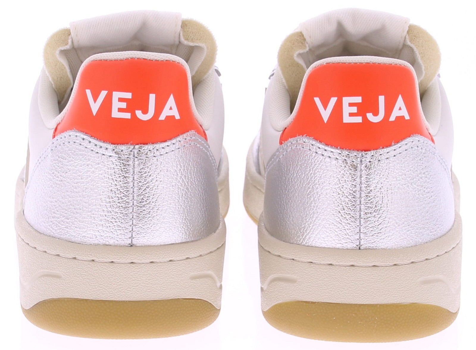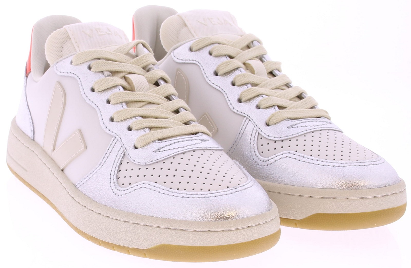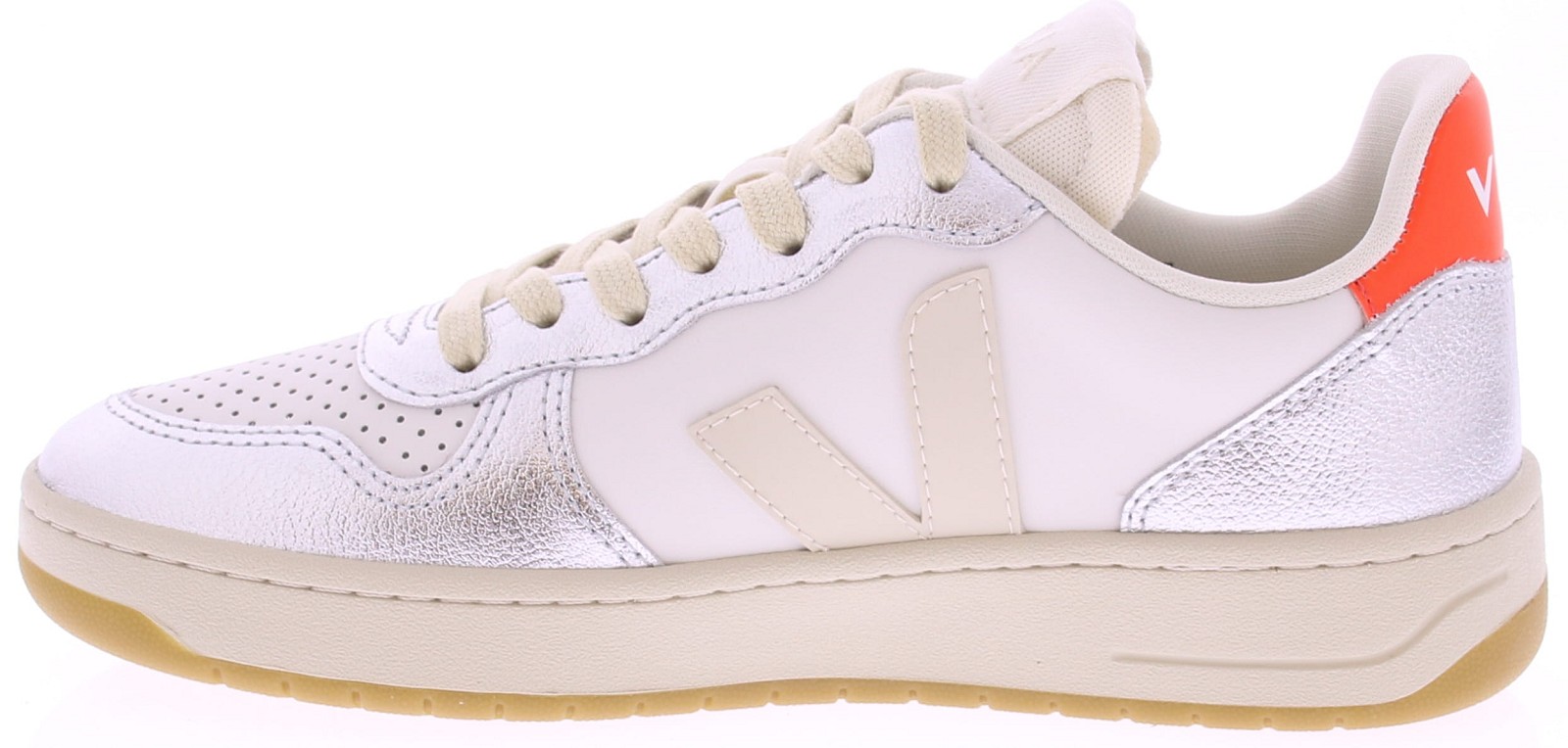White and silver organic leather women's sneaker from Veja. Made in Brazil with an upper made of OT (Organic Traced) leather, sourced from 100% certified organic farms in Uruguay, a country known for its ranching culture and high-quality leather. This is our softest and thinnest leather. It is mechanically treated to achieve suppleness and finesse and then tanned in Brazil with fewer dyes than conventional leather. VEJA uses dyes that comply with regulations and ensures responsible water usage during the tanning process.