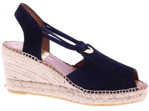 Dark blue suede women's wedge sandals from Viguera. These women's espadrilles are crafted from soft suede and feature an open toe for a summery look. The rope-trimmed wedge heel is approximately 7 cm high, and the elastic straps at the instep ensure a comfortable and stable fit. They pair beautifully with dresses, skirts, or summer pants. Discover other women's espadrilles from Viguera at Klijsen.