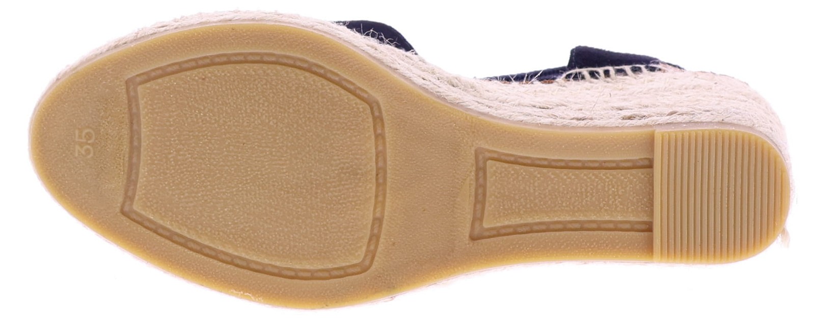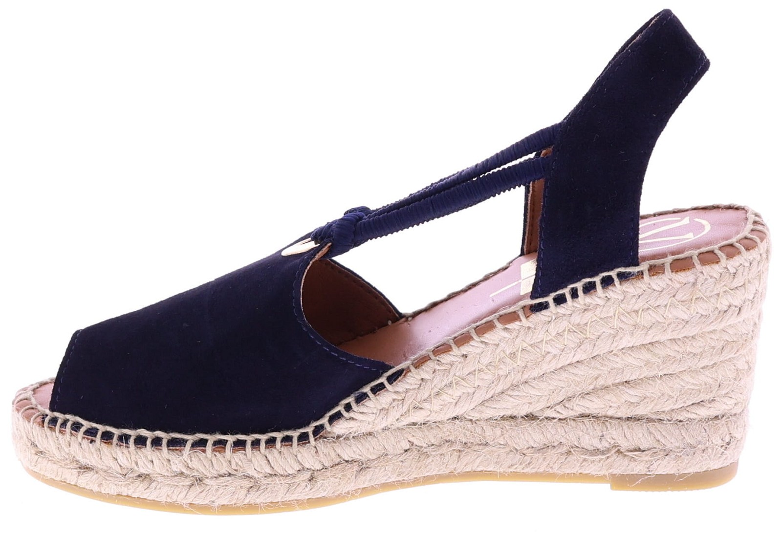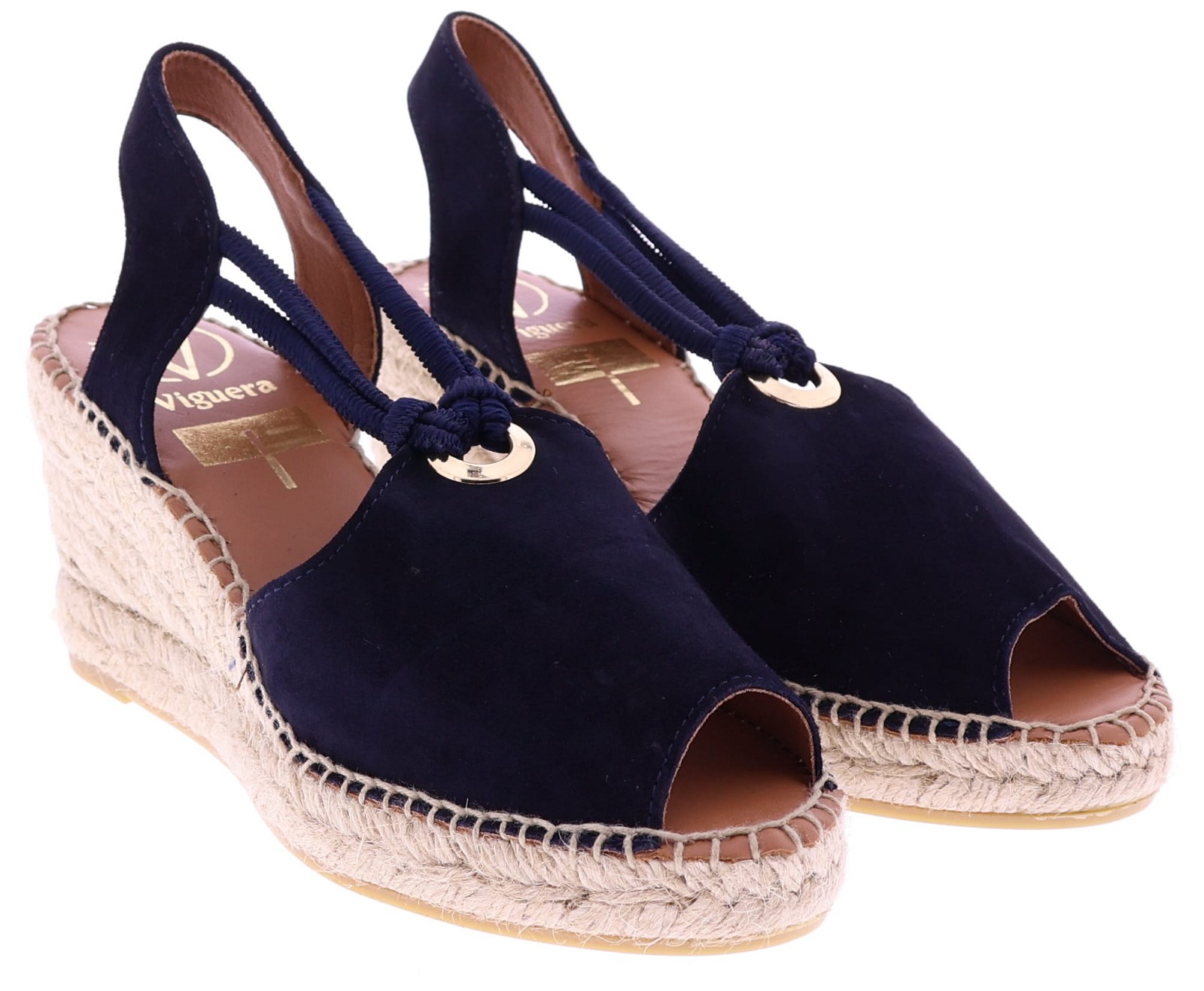 Dark blue suede women's wedge sandals from Viguera. These women's espadrilles are crafted from soft suede and feature an open toe for a summery look. The rope-trimmed wedge heel is approximately 7 cm high, and the elastic straps at the instep ensure a comfortable and stable fit. They pair beautifully with dresses, skirts, or summer pants. Discover other women's espadrilles from Viguera at Klijsen.