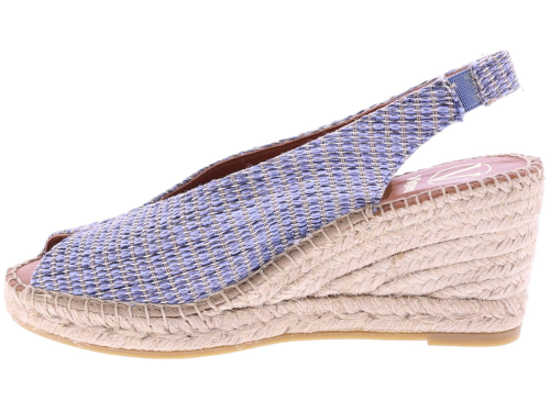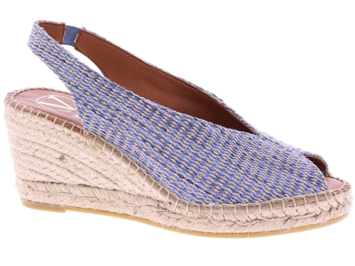 Denim-colored raffia women's espadrilles from Viguera. These espadrilles feature a raffia upper woven with a brown and subtle silver thread for a summery look. The approximately 7 cm wedge heel is set on a classic rope sole, creating a feminine silhouette. The open toe and elastic heel offer extra comfort and a secure fit. They pair beautifully with dresses, skirts, or airy summer pants. Discover other women's espadrilles from Viguera at Klijsen.