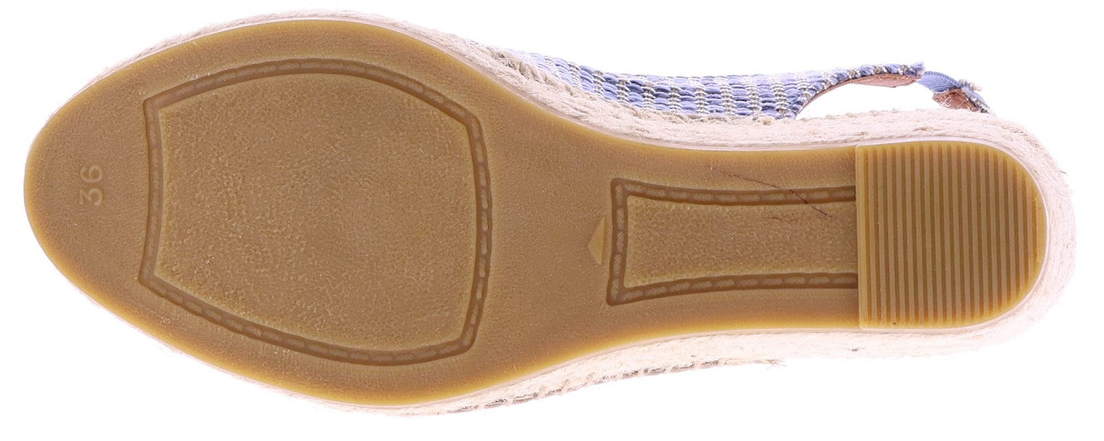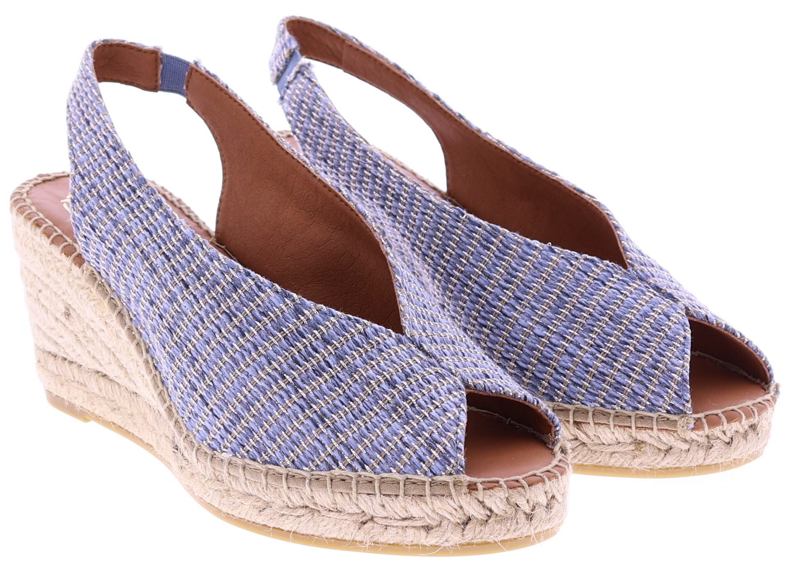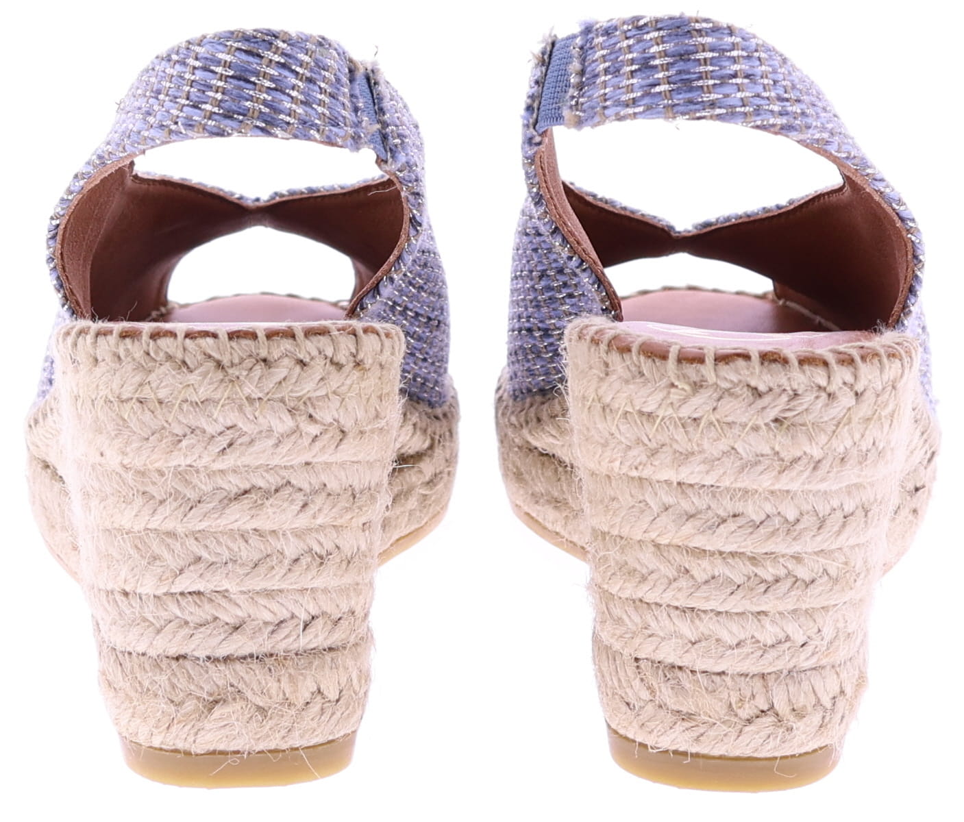 Denim-colored raffia women's espadrilles from Viguera. These espadrilles feature a raffia upper woven with a brown and subtle silver thread for a summery look. The approximately 7 cm wedge heel is set on a classic rope sole, creating a feminine silhouette. The open toe and elastic heel offer extra comfort and a secure fit. They pair beautifully with dresses, skirts, or airy summer pants. Discover other women's espadrilles from Viguera at Klijsen.