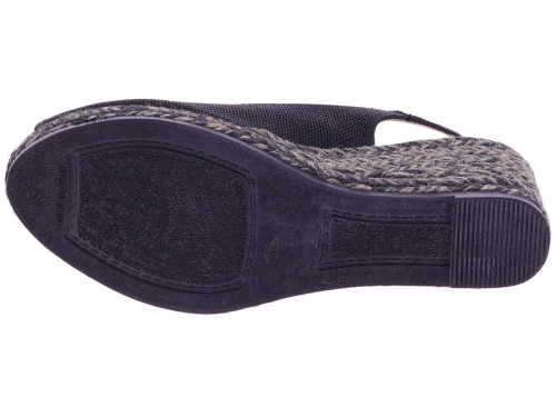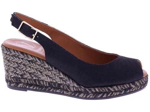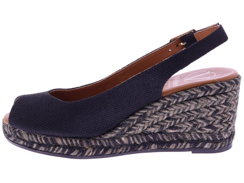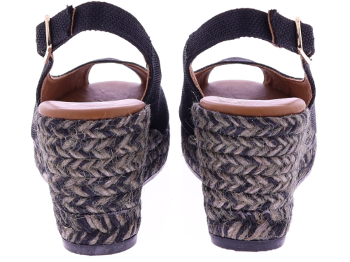Black fabric women's espadrilles with a wedge heel from Viguera. These espadrilles have a fabric upper and a rope sole in shades of gray and black, creating a playful and summery look. The wedge heel is 7 cm high. The heel strap with an adjustable buckle ensures a secure fit and extra support. They pair beautifully with dresses, skirts, or airy trousers. Discover other women's espadrilles from Viguera at Klijsen.