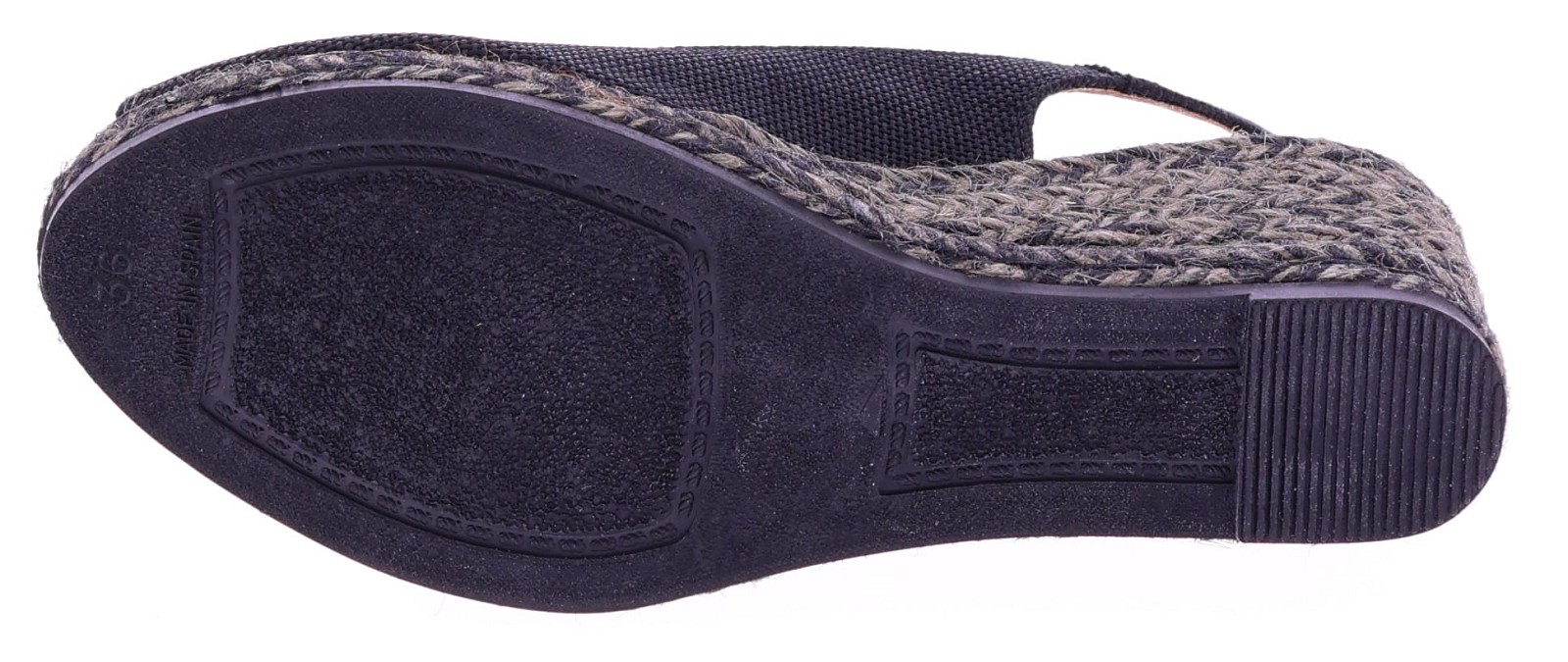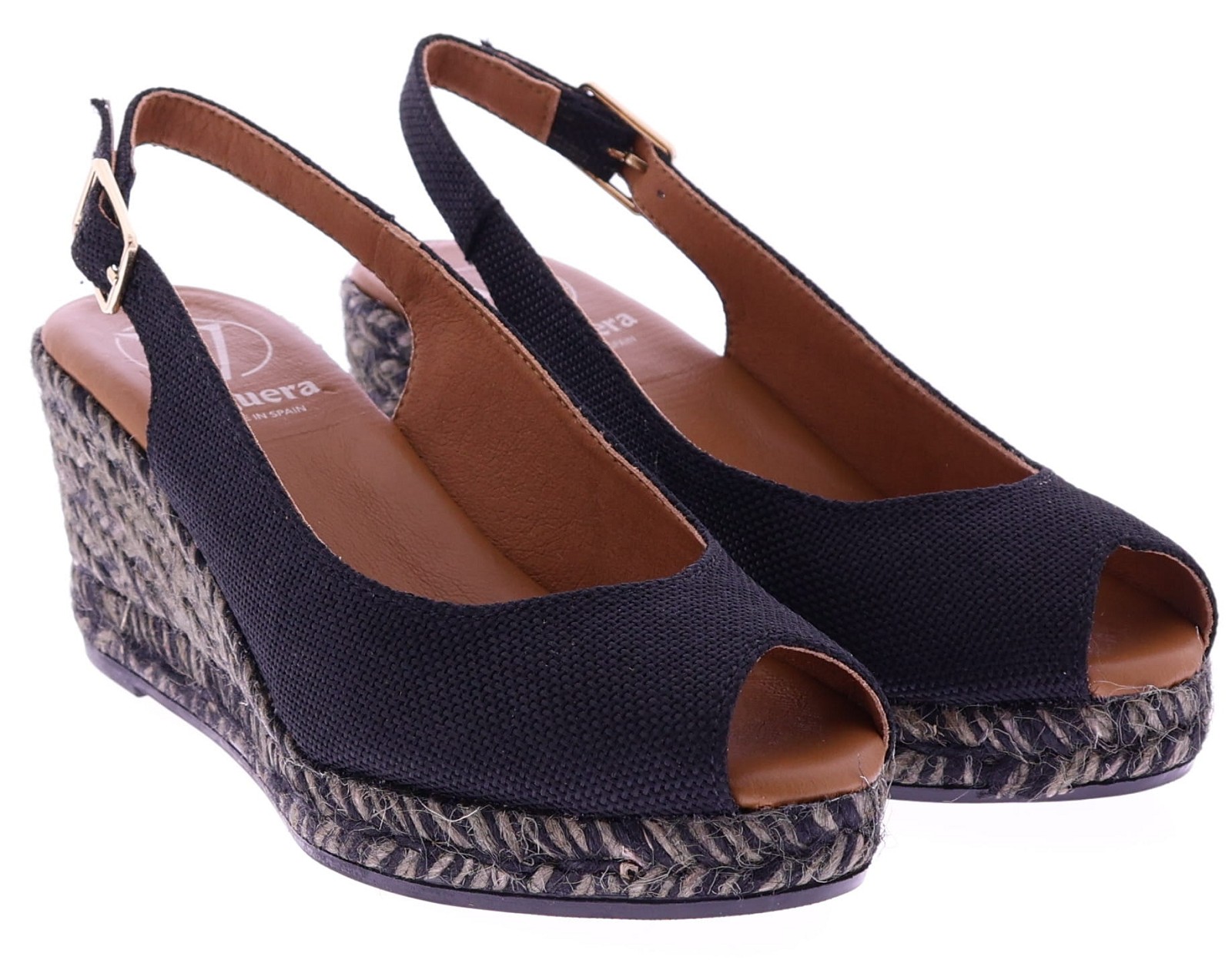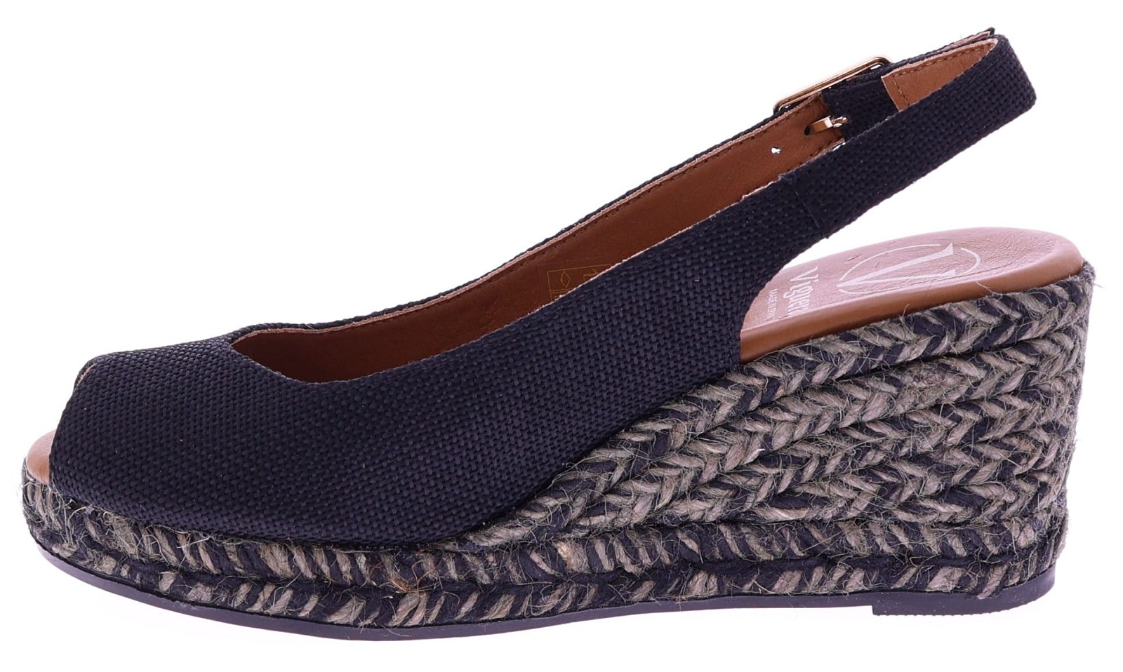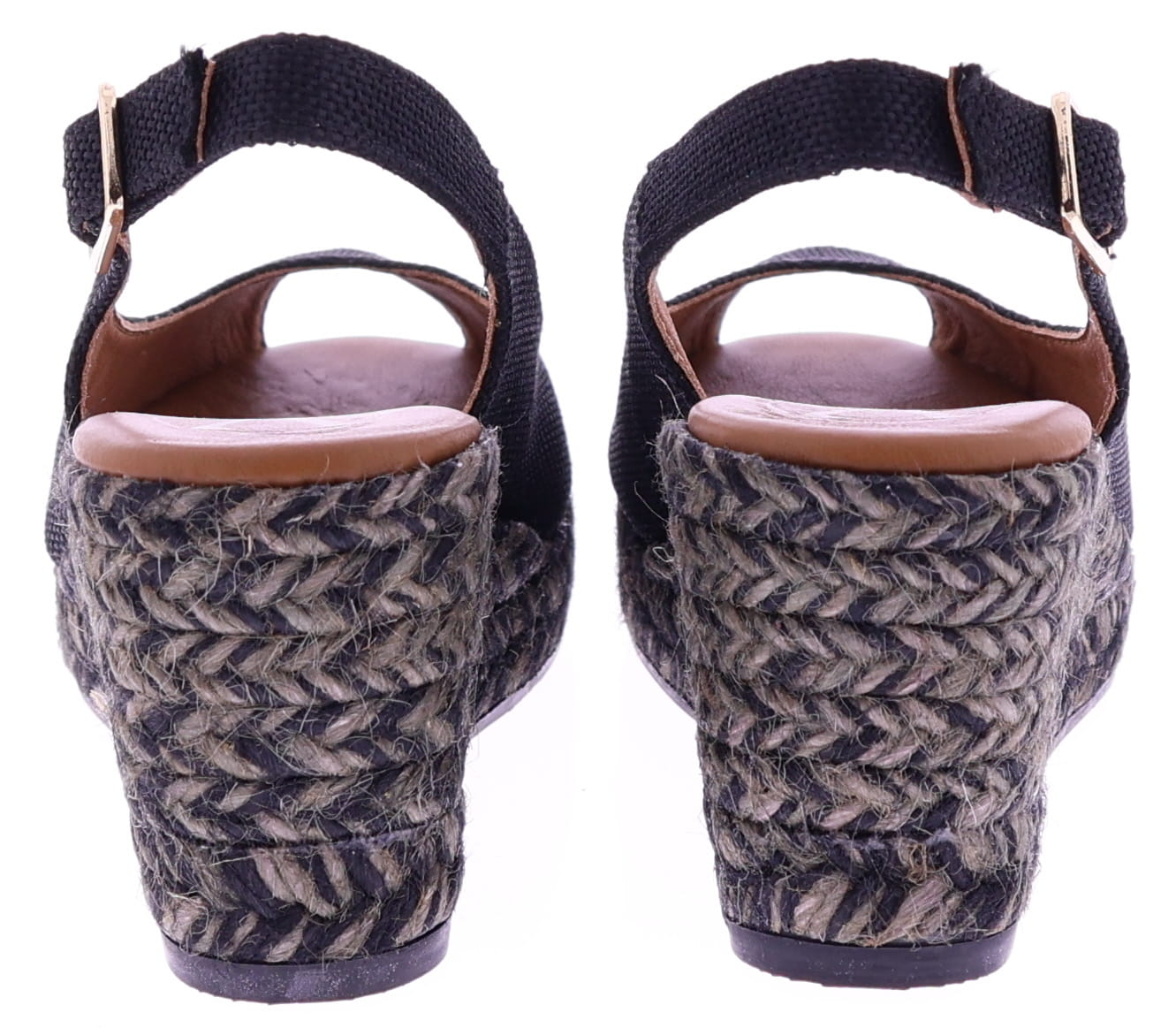 Black fabric women's espadrilles with a wedge heel from Viguera. These espadrilles have a fabric upper and a rope sole in shades of gray and black, creating a playful and summery look. The wedge heel is 7 cm high. The heel strap with an adjustable buckle ensures a secure fit and extra support. They pair beautifully with dresses, skirts, or airy trousers. Discover other women's espadrilles from Viguera at Klijsen.