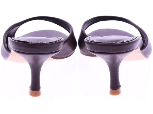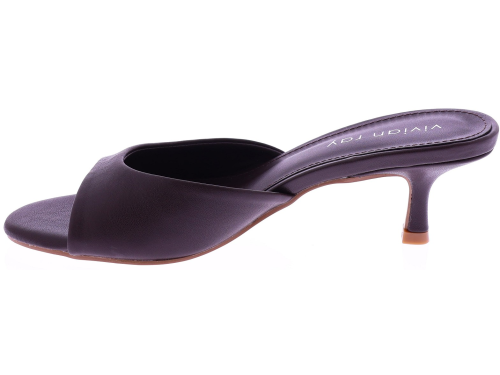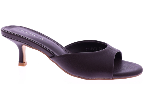Vivian Ray's dark brown PU leather women's slipper mule, model Ziva. This mule features a wide strap across the forefoot and a 5cm heel for a feminine and stylish look. The sole is made of thunit. A stylish and easy-to-wear mule that's perfect for both casual and formal outfits.