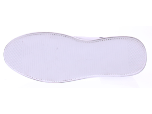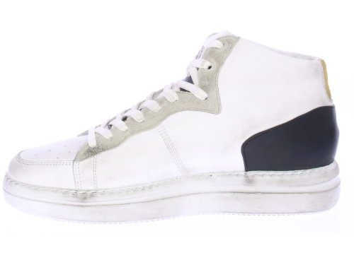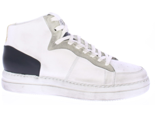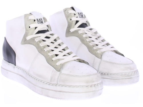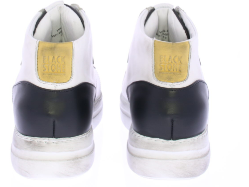 White leather ankle-high men's sneakers from Blackstone. The shoe has a vintage look and a black leather heel. The sole is rubber, and the leather insole is removable.