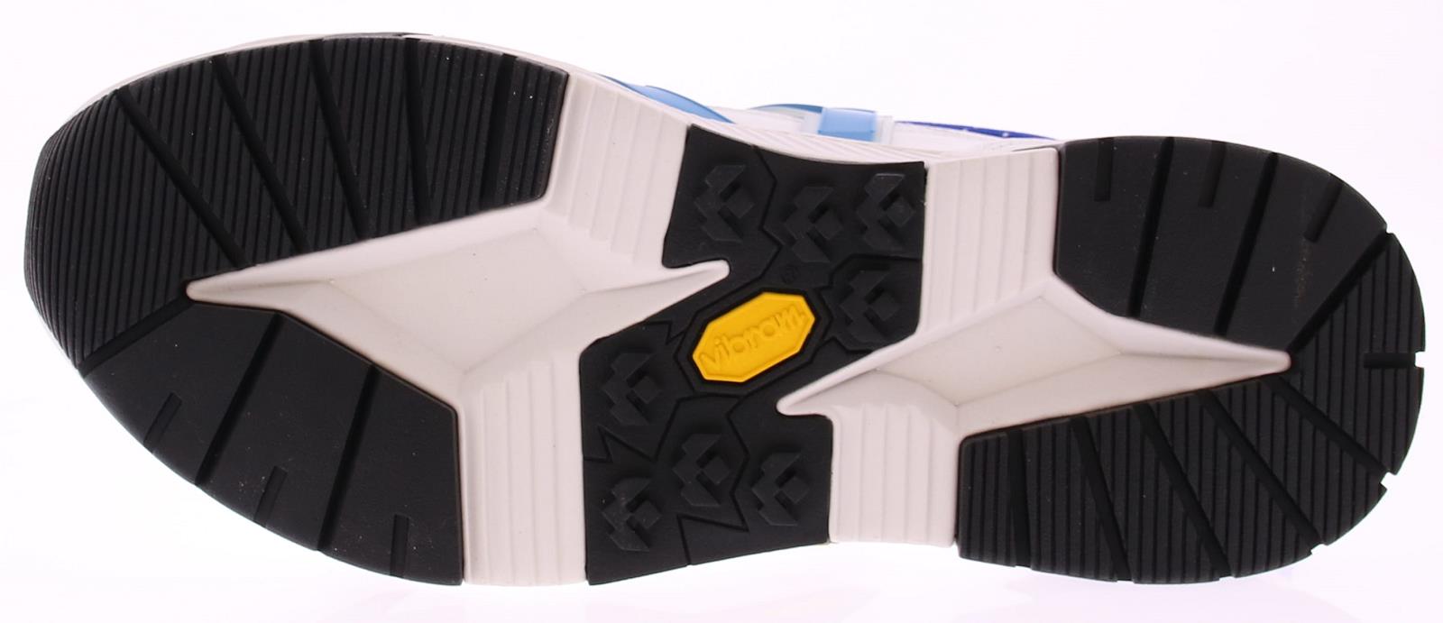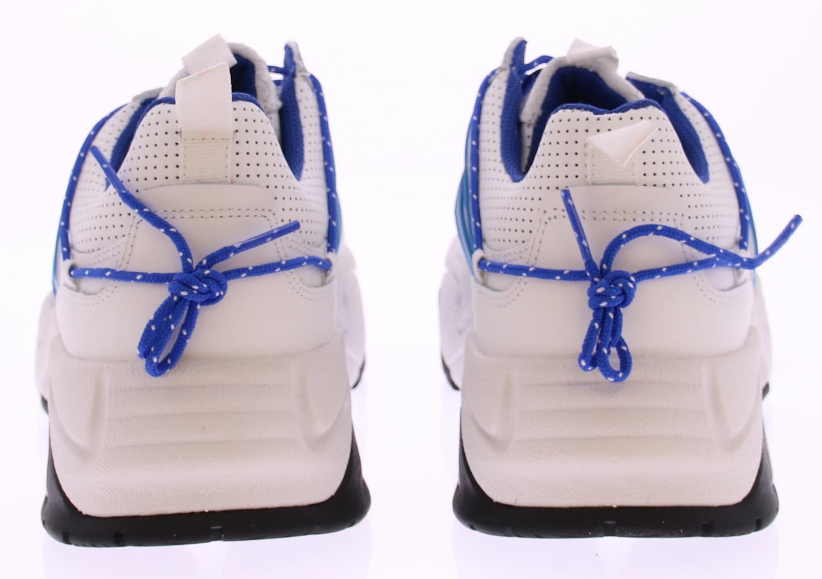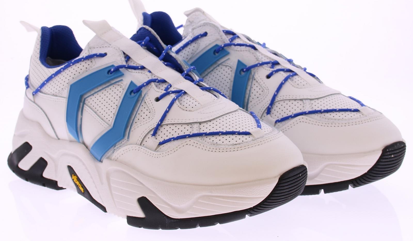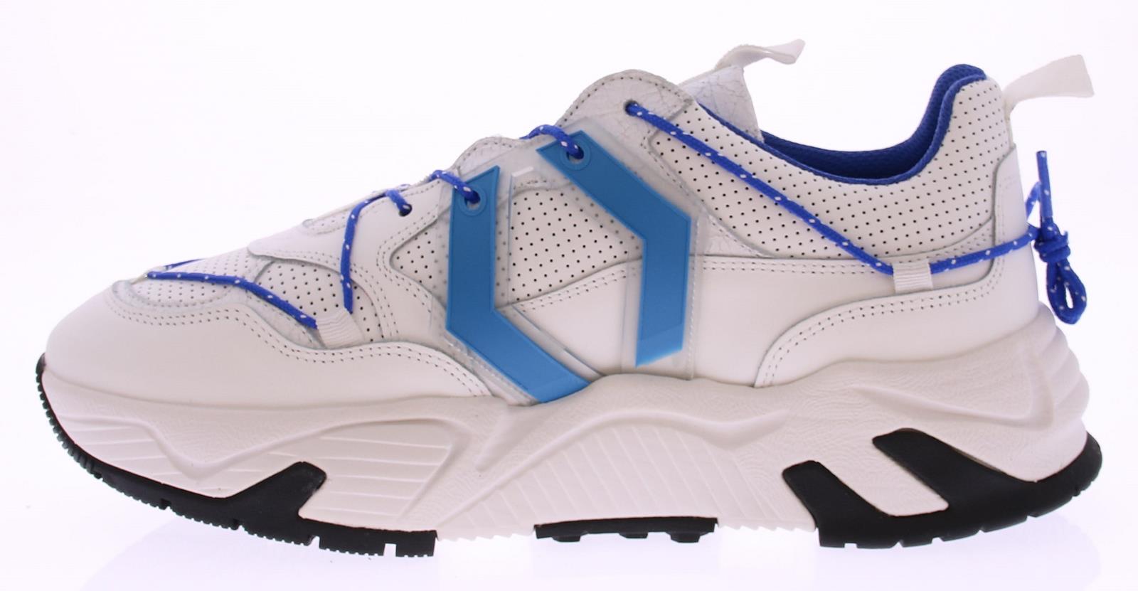 White leather men's sneaker by Mikakus, the brand of footballer Andres Iniesta. This sneaker is finished with blue accents and comes on a bulky white/black rubber vibram sole. The blue lace can be fastened at the back of the shoe with an included quick-release fastener. The insole is removable.