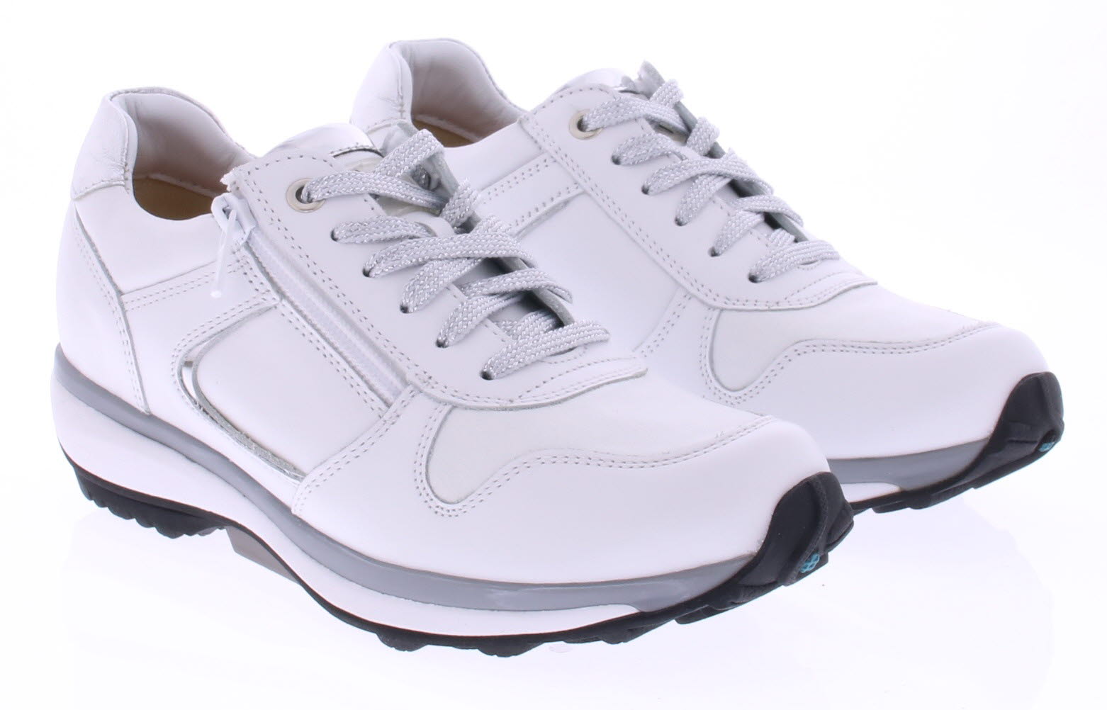 White leather women's sneaker by Xsensible. The shoe is equipped with the "stretchwalker" developed by Xsensible. This is based on a wooden balance slipper from Japan and ensures a natural and healthy posture. In combination with perfect cushioning, stability and firm grip, this shoe gives you the most comfortable walking experience. The sneaker has a removable footbed and a wider fit.