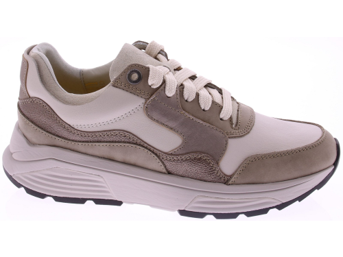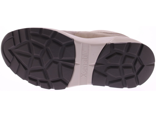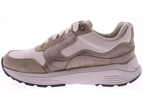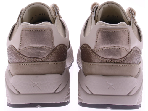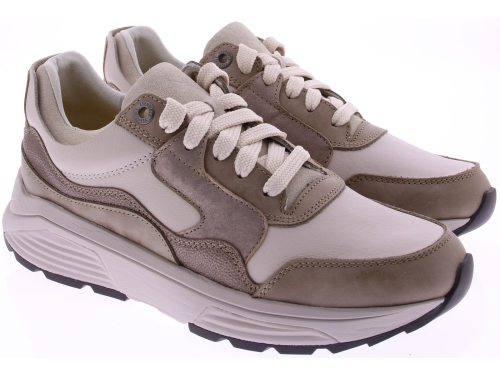 As seen in Linda and on TV! Beige and taupe leather women's sneaker from Xsensible. This sneaker is made of super soft stretch leather. The soft padding on the edge of the shoe is combined with appliqués and shiny metallic details. This shoe features the "stretchwalker" developed by Xsensible. This is based on a wooden balance slipper from Japan and ensures a natural and healthy posture. Combined with perfect cushioning, stability and firm grip, this shoe gives you the most comfortable walking experience. The sneaker has a removable footbed and a wider fit.