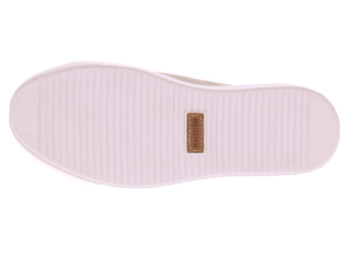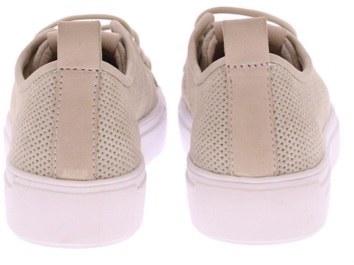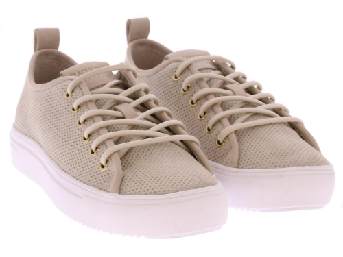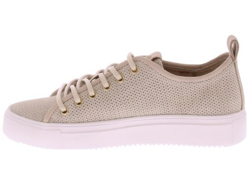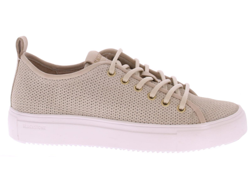 Suede perforated women's sneaker from Blackstone in the color sand. With the brand logo on the tongue. The lining is made of leather, a sturdy counterfort contributes to walking comfort. The footbed is removable. The white rubber sole has a fine profile and measures approximately 3 cm.