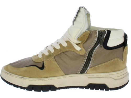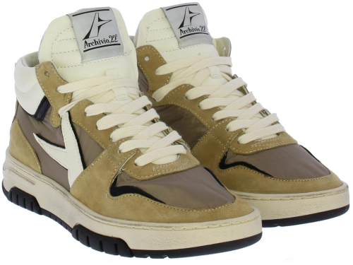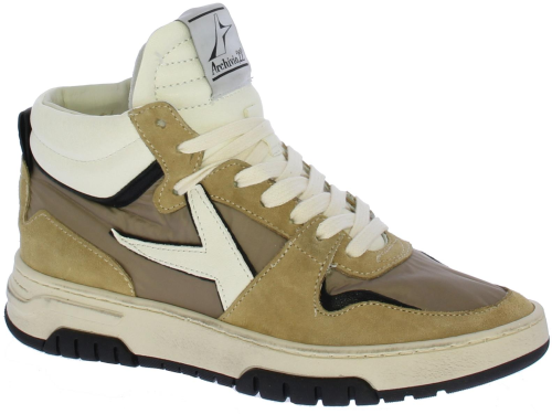 Beige with taupe-colored high women's sneaker from Archivio. This high sneaker is made of beige suede taupe-colored panels. The white laces complete the picture. A logo in leather can be found on the side of the shoe. The shoe offers excellent comfort thanks to the removable cork footbed, which adapts to every different fit and the shoe also has an interior of supple leather. The sole is almost 3 centimeters. And thanks to the handy side zipper you can also easily put it on and take it off!