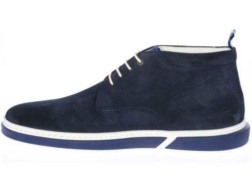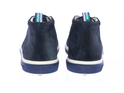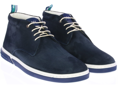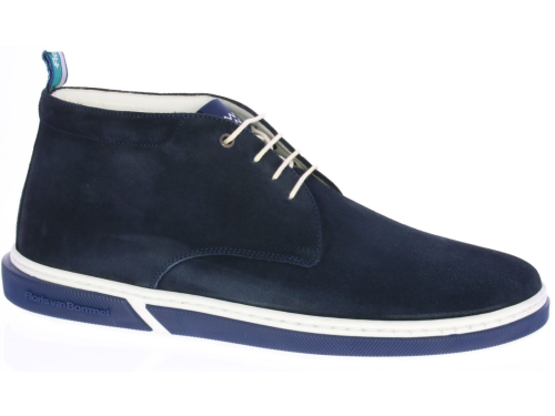 Donker blauw suede heren sneaker van Floris van Bommel. De schoen heeft een leren voering en rubber zool. De breedte is G1/2. Er zit een treklus aan de hiel. De binnenzool is uitneembaar.