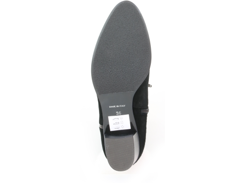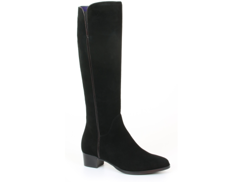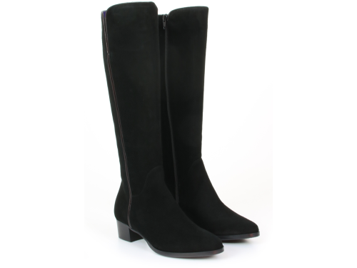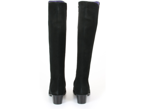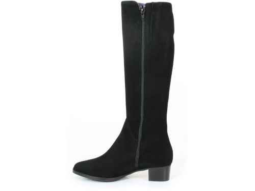 Zwart suede dames laarzen van Nalini. De laars is gemaakt met een XS-schacht zodat hij zeer geschikt is voor een smalle kuit. De lange laars is afgewerkt met een elegante leren bies over de gehele schacht. De hak van de laars is 3 cm en de schacht is aan de voorzijde iets hoger dan aan de achterzijde.