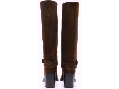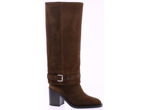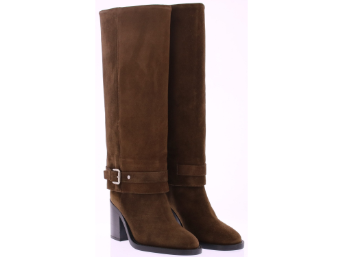Bruin suede lange laars voor dames van het merk Alpe. Deze lange laars van het Spaanse merk Alpe straalt elegante eenvoud uit met een stoer randje. Uitgevoerd in rijk bruin suède en voorzien van een decoratief bandje rond de enkel met een verfijnde gespsluiting. De rechte blokhak van 7 cm biedt een krachtige, vrouwelijke houding zonder in te leveren op comfort. Draagbaar onder een jurk of over een skinny jeans – dit is een veelzijdige eyecatcher voor het najaar en de winter.