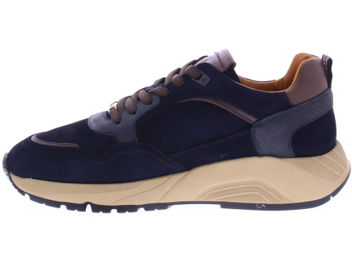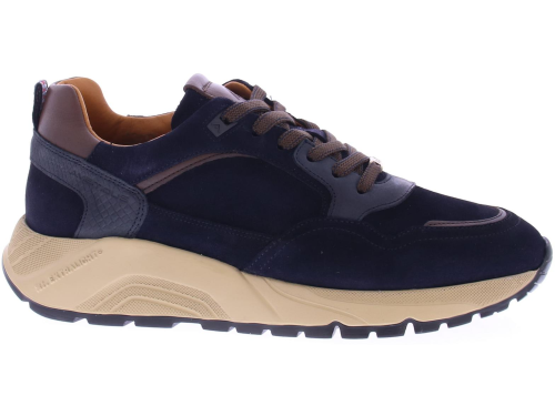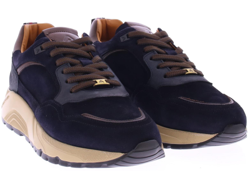 Donkerblauwe suède heren sneaker van AMBITIOUS. Deze schoen komt in blauw suède met donkerbruine veters. De schoen heeft een sportieve dikke zool voor goede demping en heeft een uitneembare binnenzool.