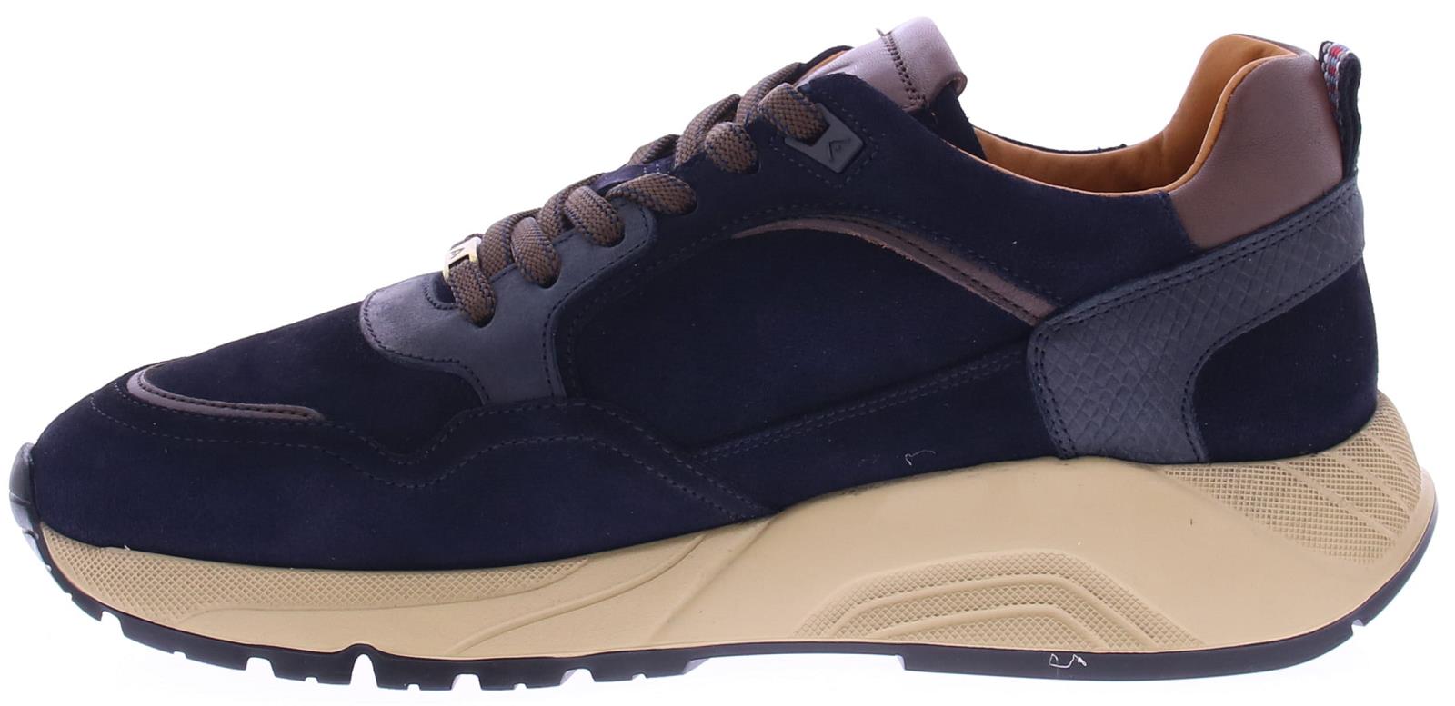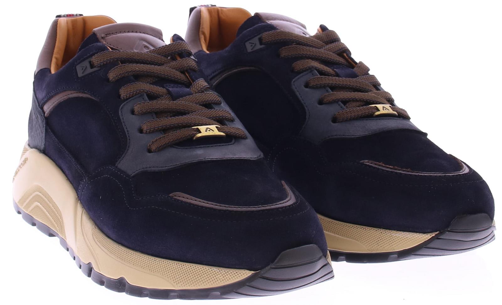 Donkerblauwe suède heren sneaker van AMBITIOUS. Deze schoen komt in blauw suède met donkerbruine veters. De schoen heeft een sportieve dikke zool voor goede demping en heeft een uitneembare binnenzool.