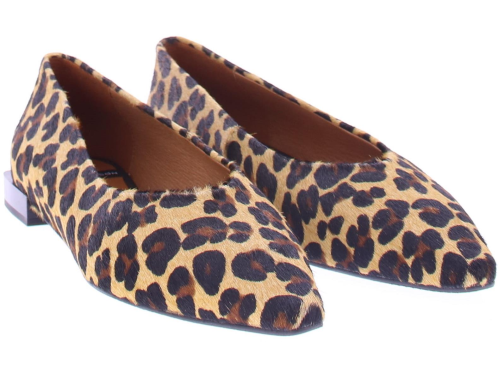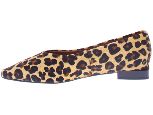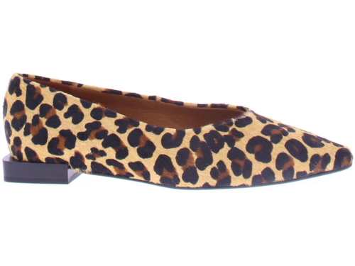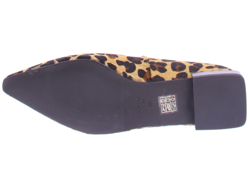 Bruin met zwart panterprint pony- haar dames pump van Angel Alarcon. Deze pump heeft een iets spitse neus en een leuke speels blokhakje van 2 cm hoog. De voering is van leer en de zool van rubber.