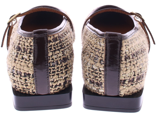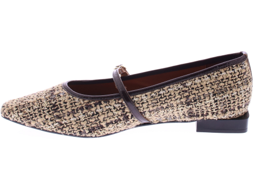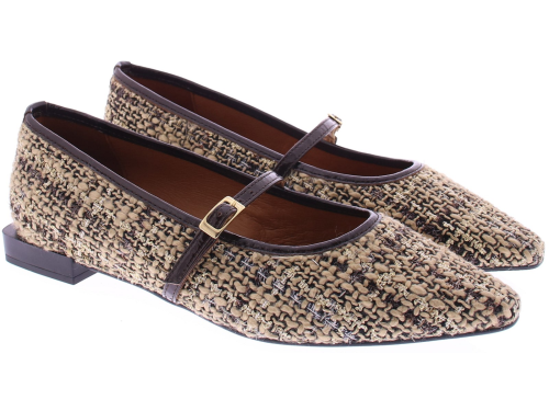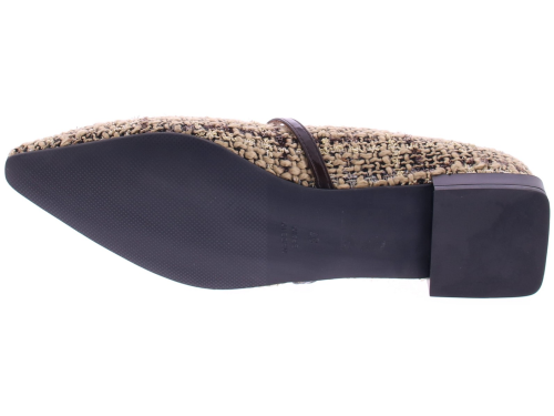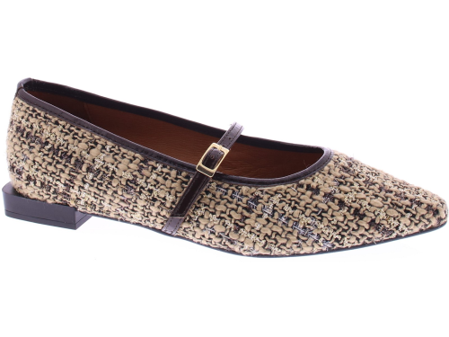 Beige stoffen dames ballerina van Angel Alcron. Deze elegante damespump is gemaakt van beige tweedstof en heeft een iets spitse neus . Opvallend detail is het bruine lakleren bandje over de wreef. De pump staat op een stijlvol blokhakje van 2 cm hoog. De binnenvoering is volledig van leer en de rubberen zool zorgt voor extra grip. Een modieuze én comfortabele keuze voor elke gelegenheid.