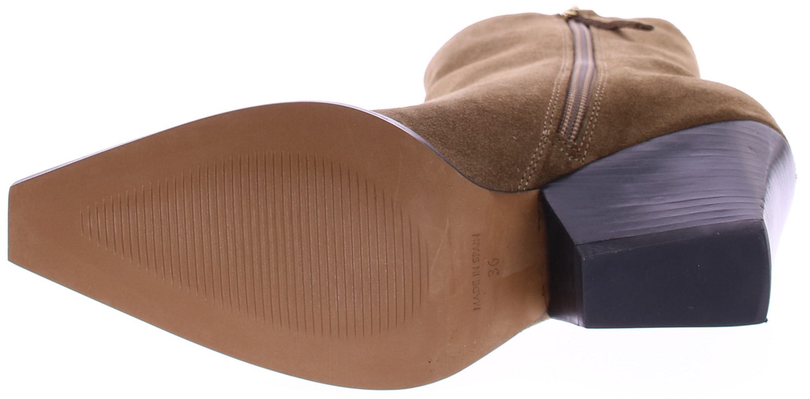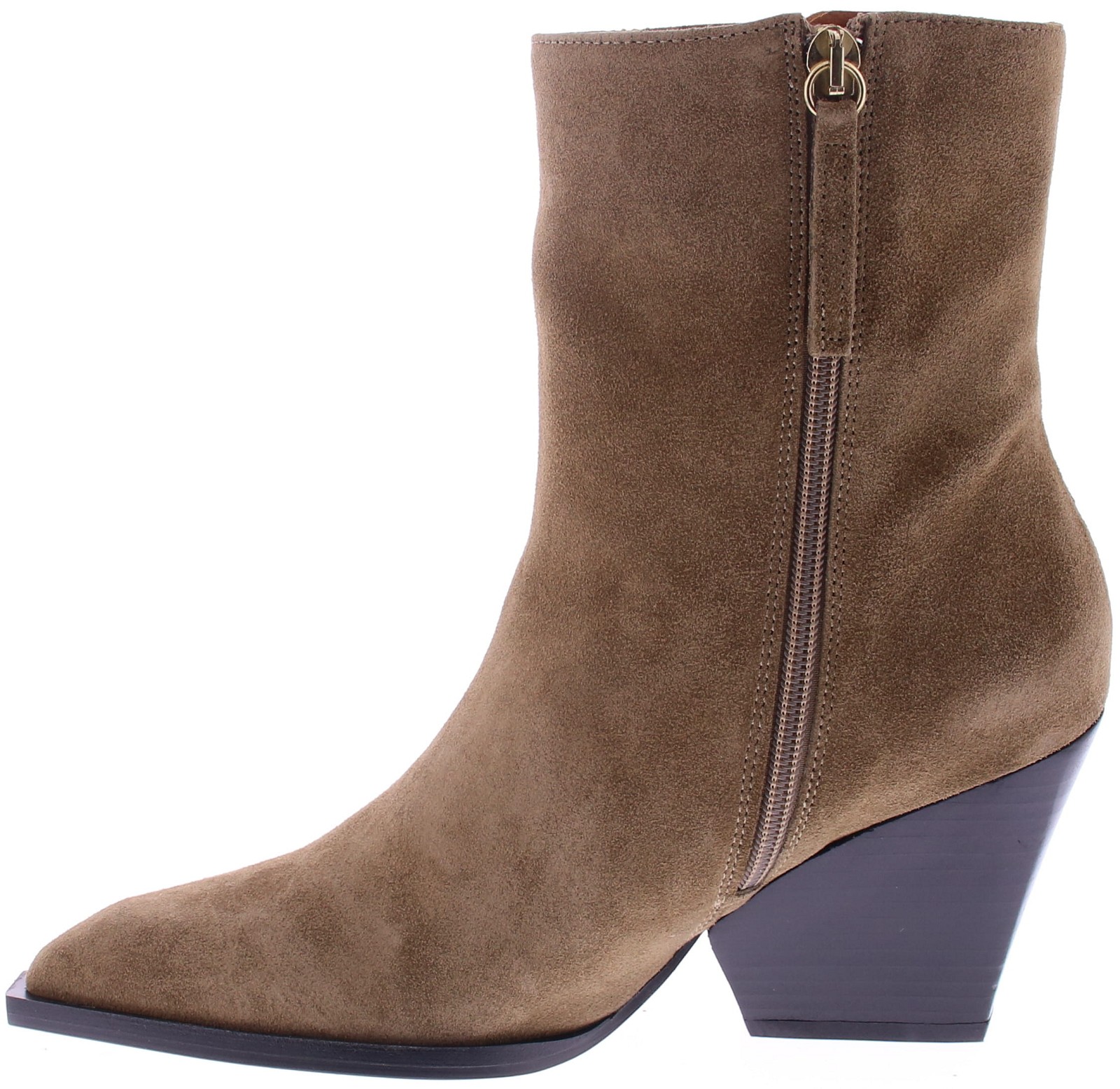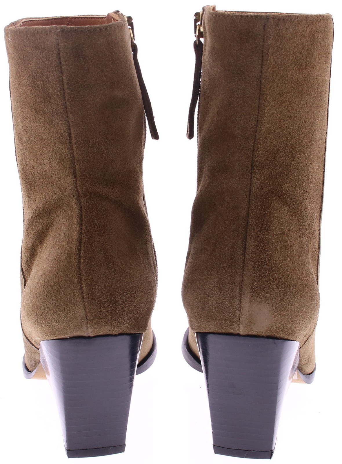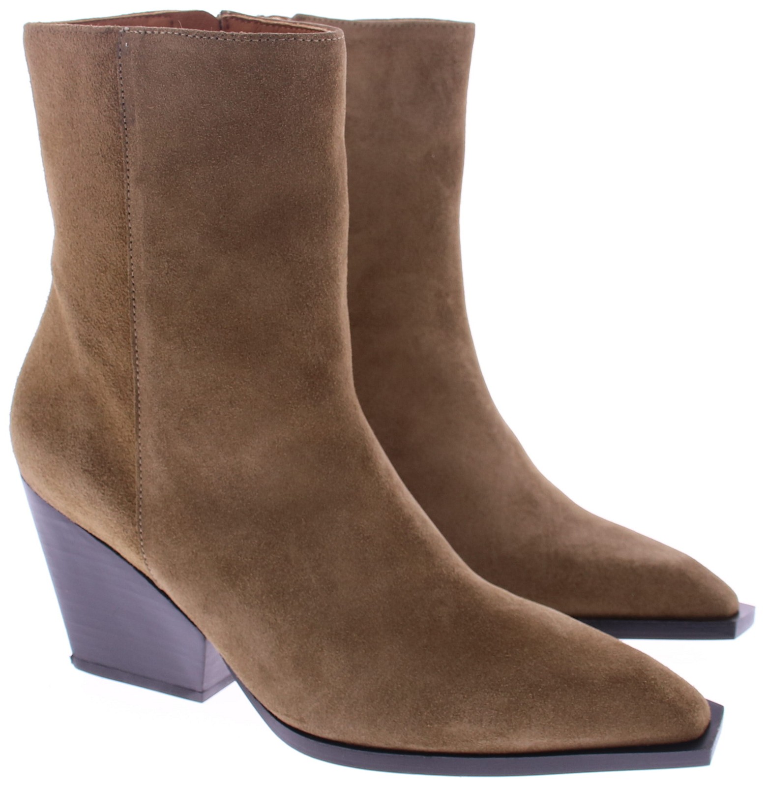 Taupe suéde dames korte laars van Angel Alarcon. Deze laars heeft een spitse neus, een schuine hak van 6 cm hoog en een rits aan de binnenkant. De voering is geheel van leer en heeft een kunststof zool.