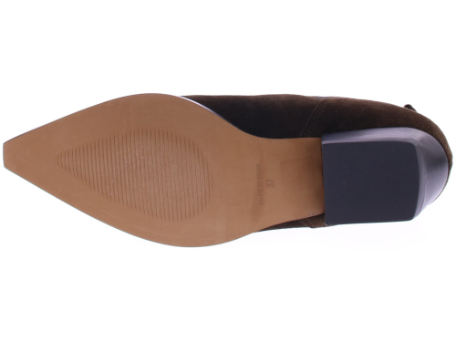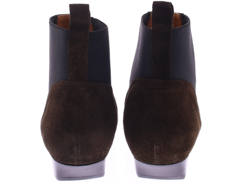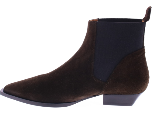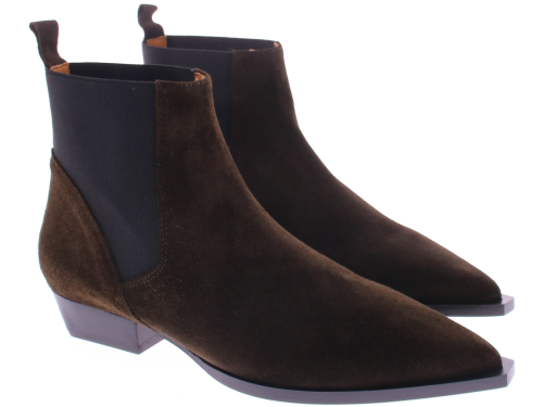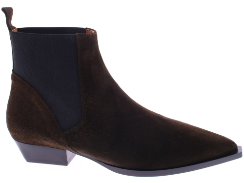 Donkerbruin suéde Chelsea korte laars van Angel Alarcon.Dit Chelsea laarsje van Angel Alarcon is uitgevoerd in donkerbruin suède en combineert moeiteloos comfort met een tijdloze uitstraling. De kenmerkende elastische inzetstukken aan de zijkanten zorgen voor een makkelijke instap en een perfecte pasvorm. Dankzij de praktische treklus aan de achterkant trek je het laarsje eenvoudig aan. De iets spitse neus en het verfijnde ontwerp geven dit model een moderne look. De leren voering zorgt voor extra comfort en de rubberen zool biedt grip bij elke stap. Een veelzijdige laars die je eindeloos kunt combineren – van casual tot chic.