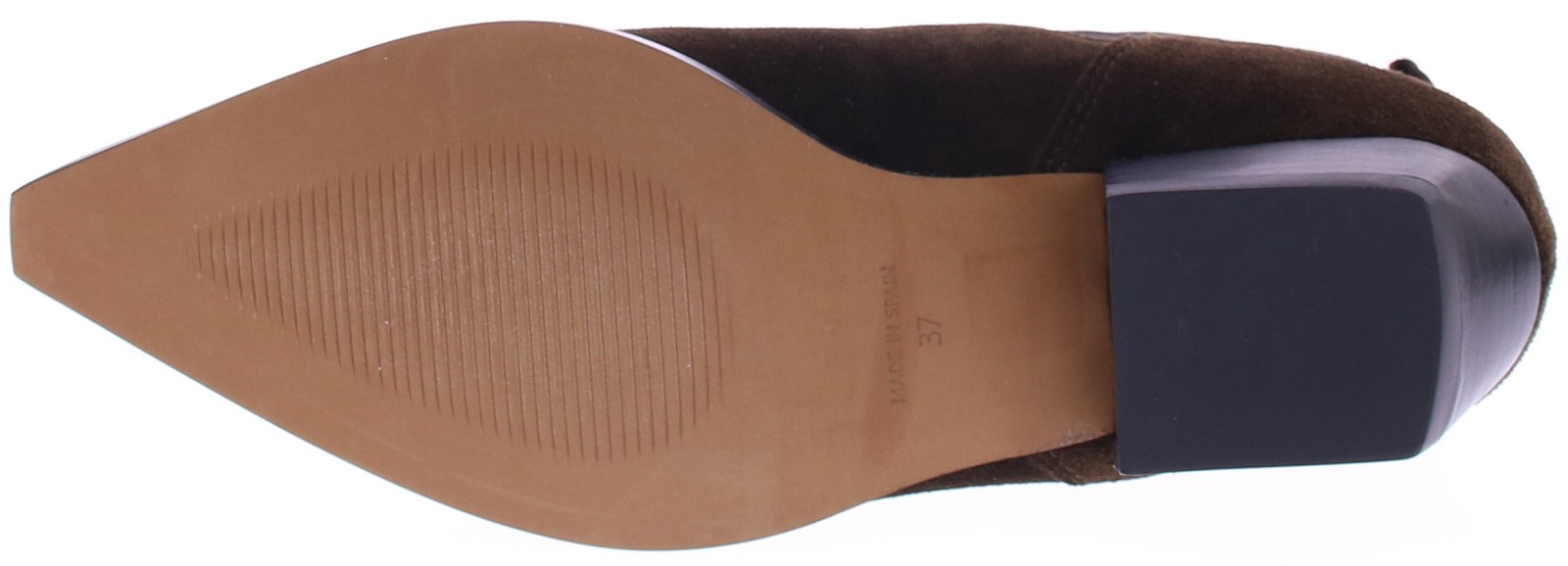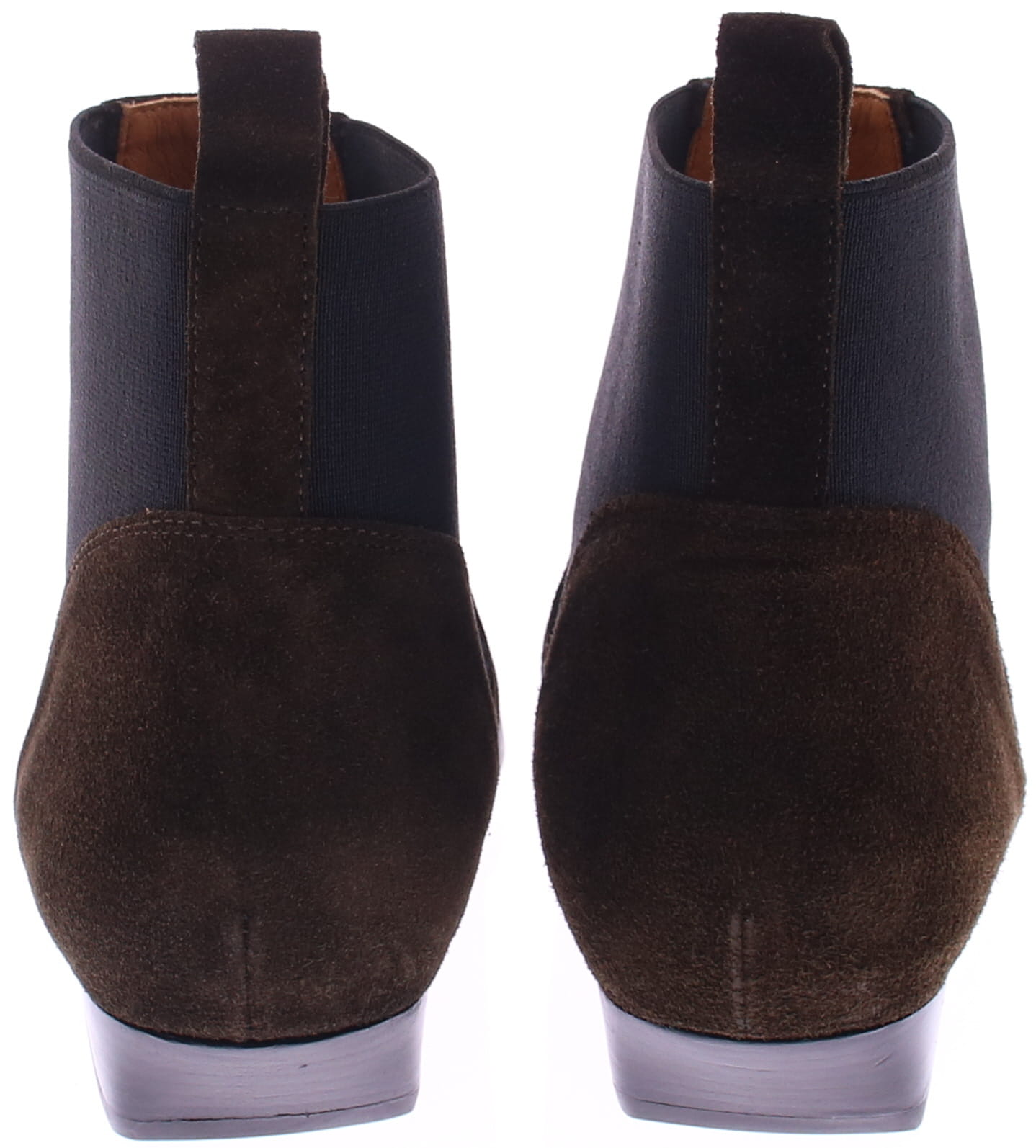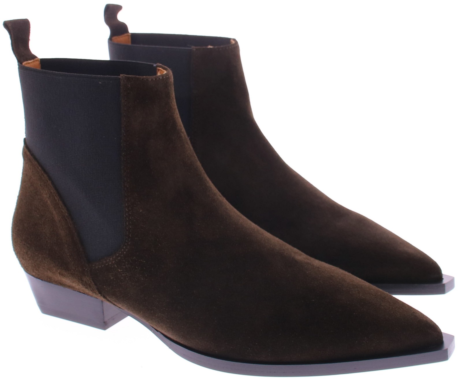 Donkerbruin suéde Chelsea korte laars van Angel Alarcon.Dit Chelsea laarsje van Angel Alarcon is uitgevoerd in donkerbruin suède en combineert moeiteloos comfort met een tijdloze uitstraling. De kenmerkende elastische inzetstukken aan de zijkanten zorgen voor een makkelijke instap en een perfecte pasvorm. Dankzij de praktische treklus aan de achterkant trek je het laarsje eenvoudig aan. De iets spitse neus en het verfijnde ontwerp geven dit model een moderne look. De leren voering zorgt voor extra comfort en de rubberen zool biedt grip bij elke stap. Een veelzijdige laars die je eindeloos kunt combineren – van casual tot chic.