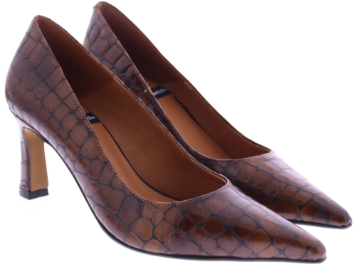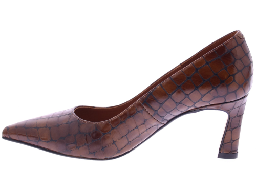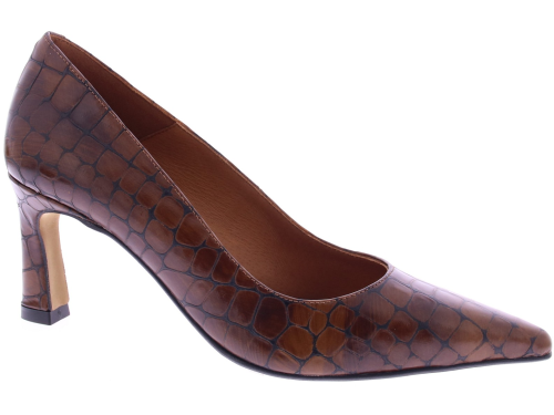 Cognac kleurige leren dames pump van Angel Alarcon. Deze pump heeft geprint leer wat deze pump een chique en luxe look geeft, terwijl de spitse neus zorgt voor een verfijnde pasvorm. De hak van 7 cm biedt precies de juiste hoogte voor een sierlijke houding zonder in te leveren op comfort. De voering is van leer en de zool van Thunit. De warme cognackleur is tijdloos en gemakkelijk te combineren met zowel casual als formele outfits.