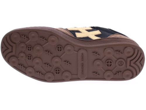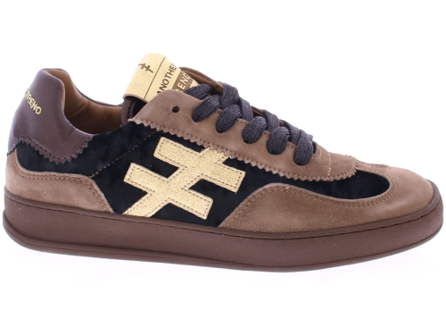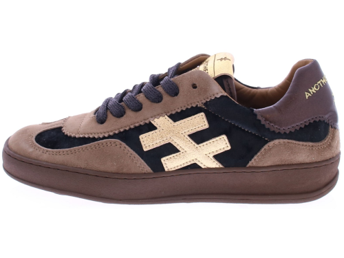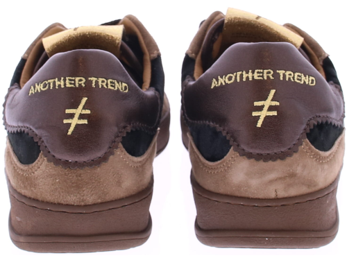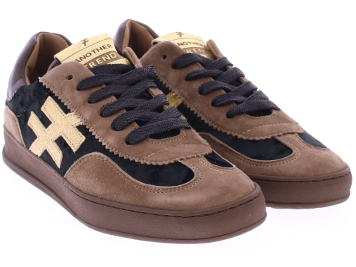 Donkerbruin suéde en velours dames sneakers van Another Trend. Deze sneakers de zijn gemaakt van donkerbruin suède en afgestyled met goudkleurig metallic leer. Het merklogo aan de zijkant is gemaakt van oranje leer. De binnenzijde is van leer voorzien van een microfiber uitneembaar voetbed. De gekartelde afwerking en de gummy zool in donkerbruin geven dit paar een Old Skool look.