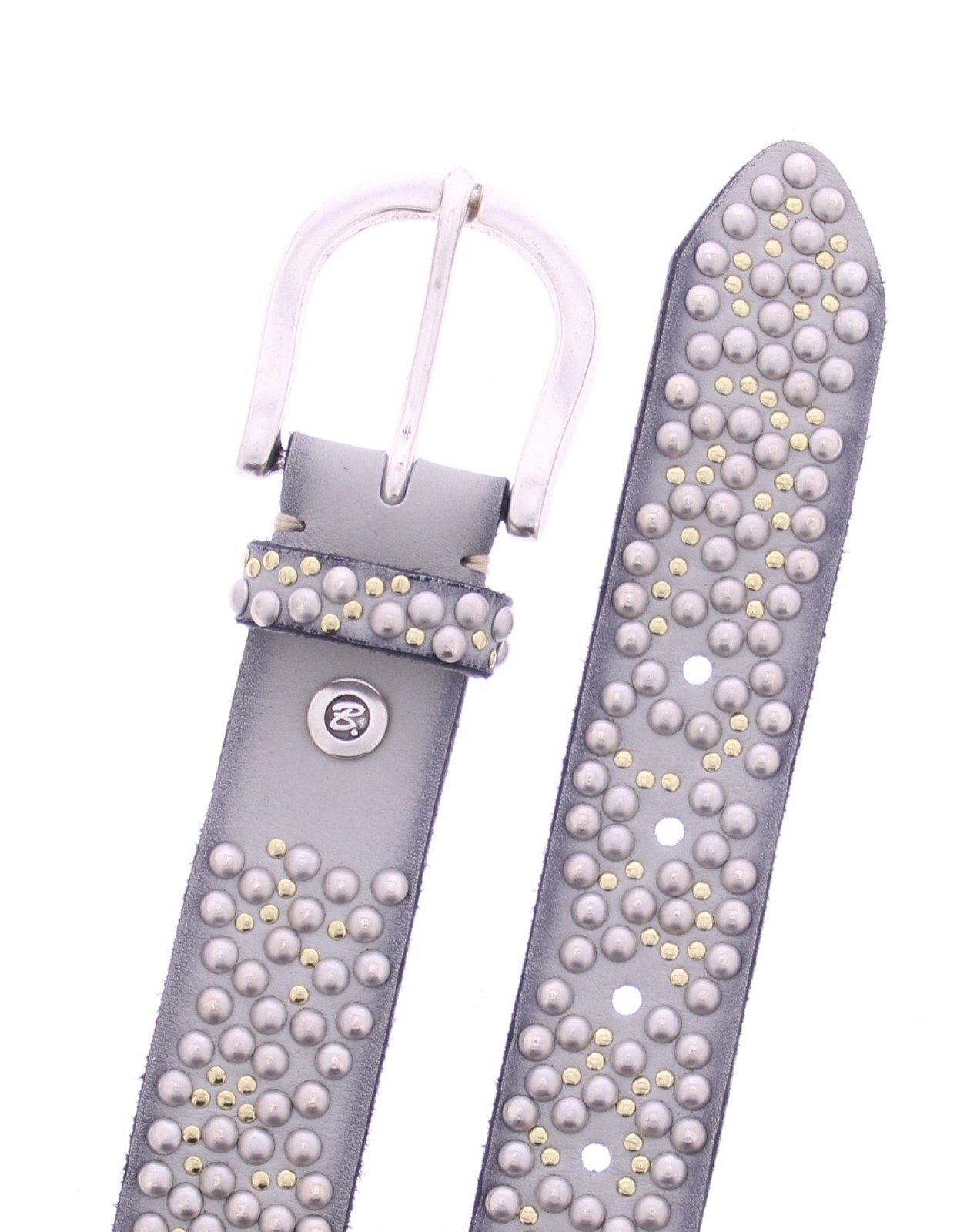 Grijs leren dames riem van B Belt. Deze mooie zacht leren riem heeft zilveren en gouden studs en is 5 cm breed.