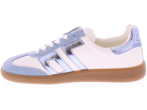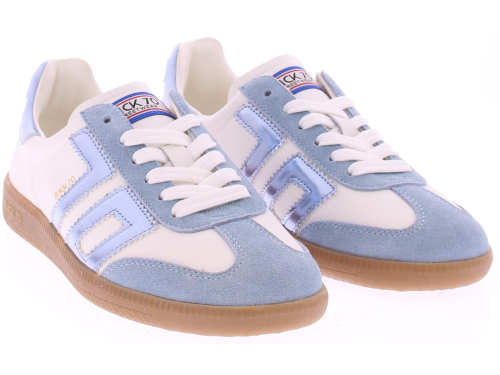 Lichtblauw suede met wit leren sneaker van Back70 voor dames. Deze retro dames-sneaker van Back70 de CLOUD 2505-19 in Lichtblauw met wit heeft een honingkleurige zool en een wit logo en hielstuk. De zool is uitneembaar. Stijlvol, comfortabel en perfect voor elke casual outfit!