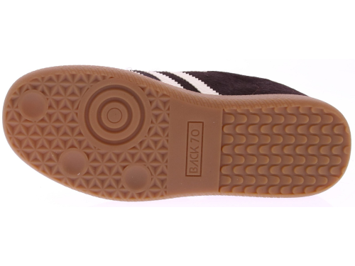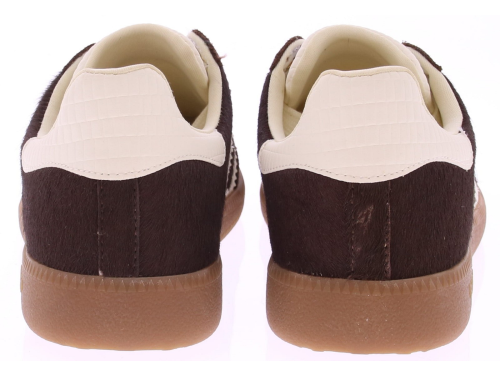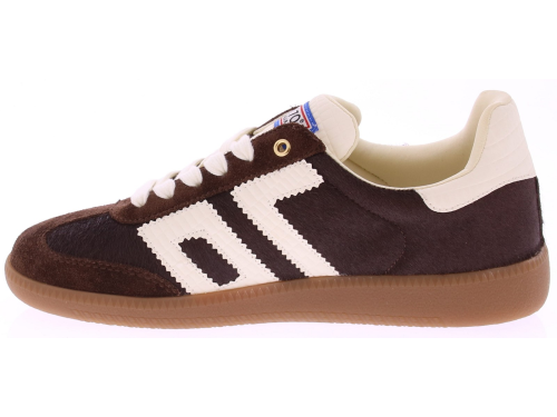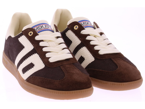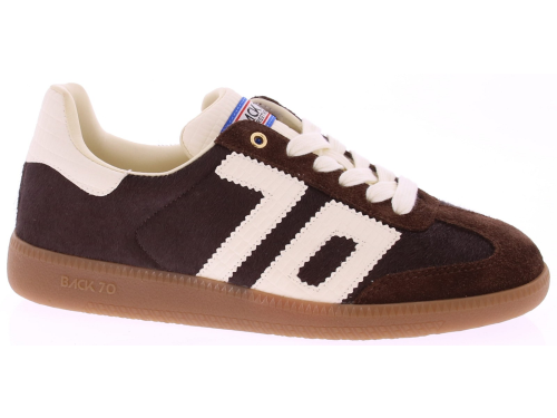 Donkerbruin suede met beige leren sneaker van Back70 voor dames. Deze retro dames-sneaker van Back70 de CLOUD P47 in donkerbruin met wit heeft een honingkleurige zool en een wit logo en hielstuk. De zool is uitneembaar. Stijlvol, comfortabel en perfect voor elke casual outfit!