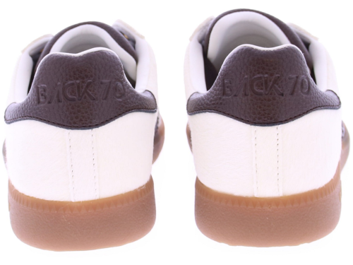 Wit suede met bruin leren sneaker van Back70 voor dames. Deze retro dames-sneaker van Back70 de CLOUD P45 in Zwart met wit heeft een honingkleurige zool en een zwart logo en hielstuk. De zool is uitneembaar. Stijlvol, comfortabel en perfect voor elke casual outfit!