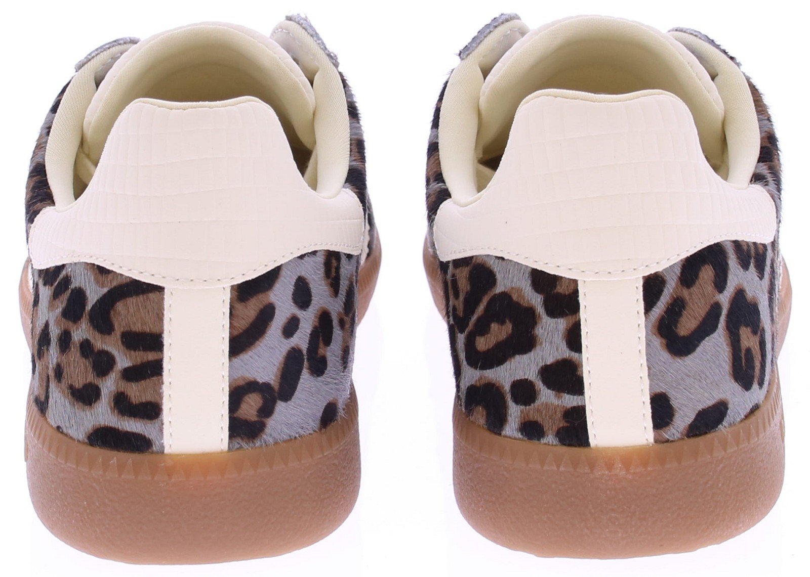 Grijs suede met panterprint sneaker van Back70 voor dames. Deze retro dames-sneaker van Back70 de CLOUD P21 in grijs panterprint heeft een honingkleurige zool en een wit logo en hielstuk. De zool is uitneembaar. Stijlvol, comfortabel en perfect voor elke casual outfit!